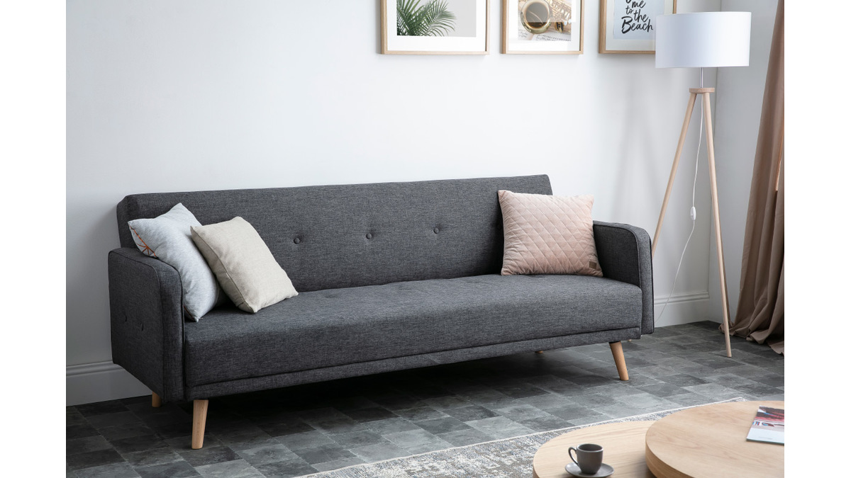 Avec son revêtement en tissu (100% polyester), sa belle couleur gris anthracite, son piétement en bois clair et sa forme épurée, ce canapé convertible 3 places forme une belle assise au design indémodable.