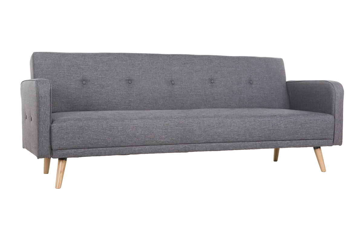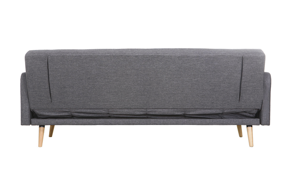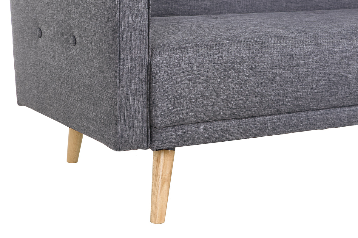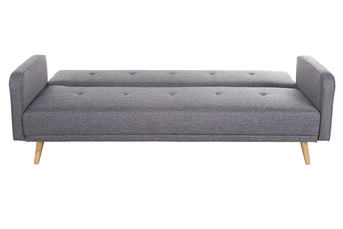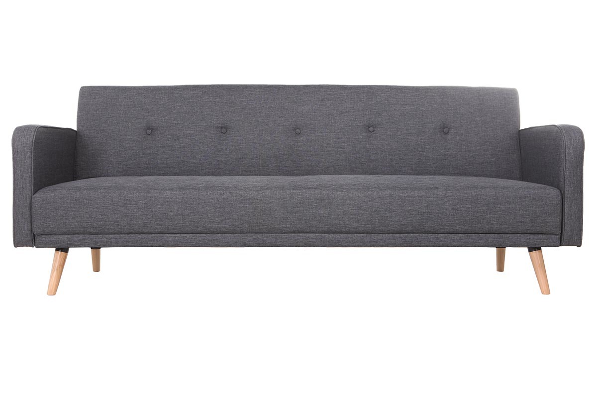 Canapé convertible scandinave 3 places en tissu gris foncé et bois clair livré prêt à monter.