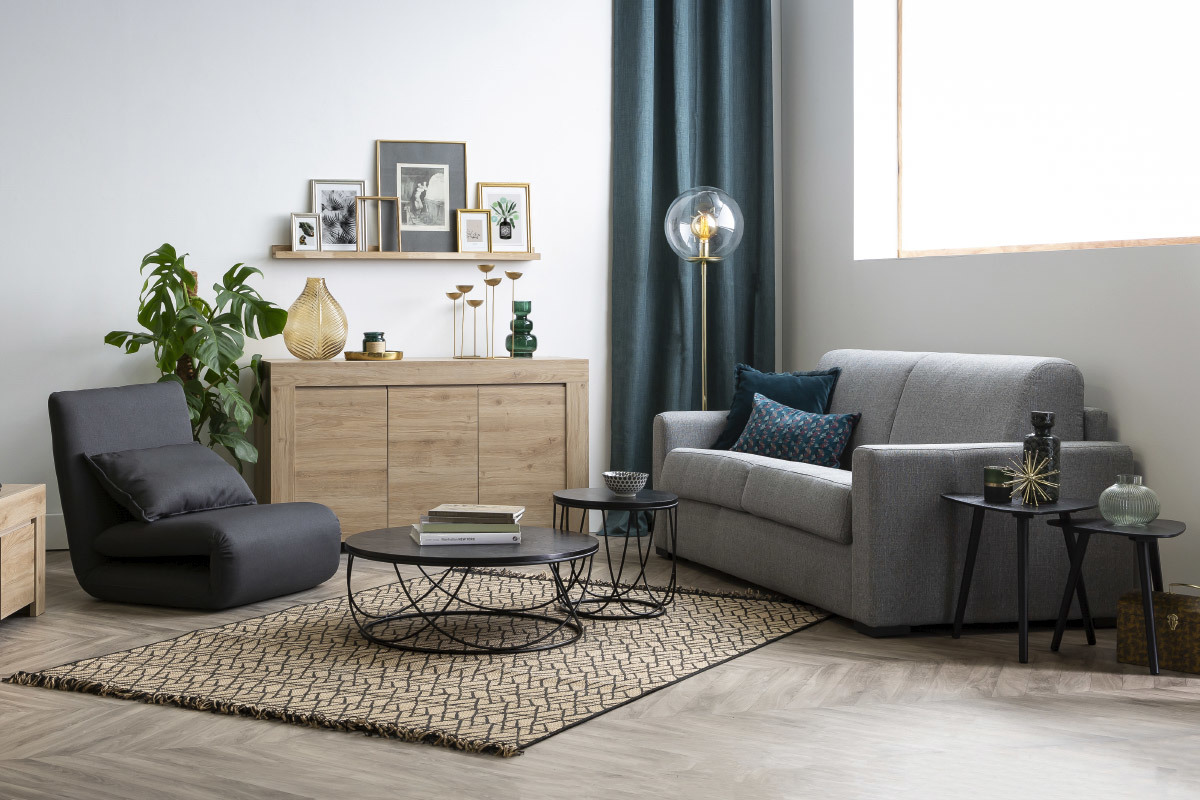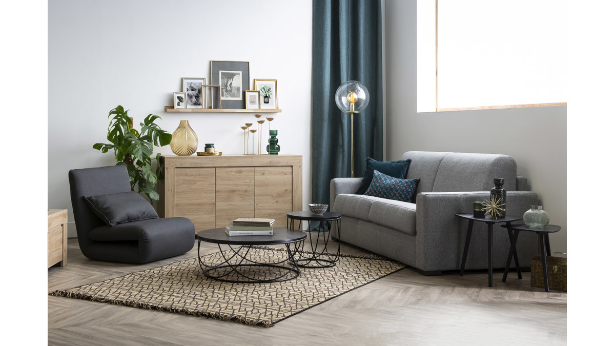 Pour un petit espace pratique et adaptable à vos besoins, accompagnez ce canapé convertible DOME d'une table basse relevable.
