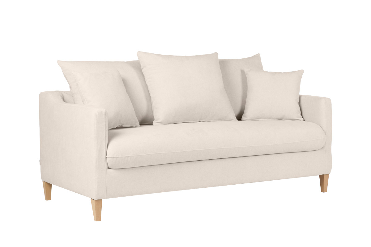 Canapé beige et bois clair livré prêt à monter. Montage simple, seuls les pieds sont à fixer. Le colis étant volumineux, nous vous conseillons de vérifier que portes et escaliers permettent son passage.