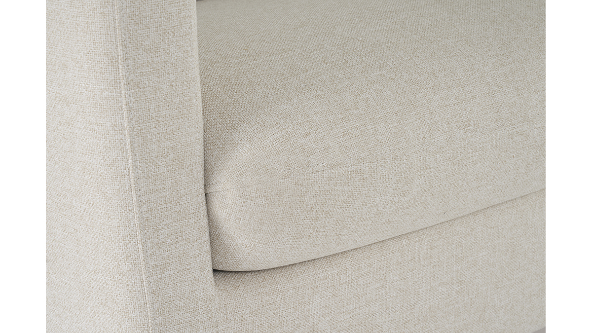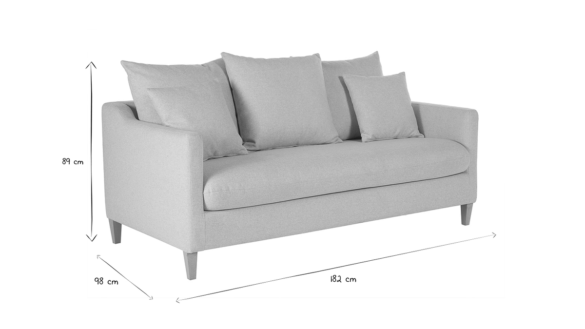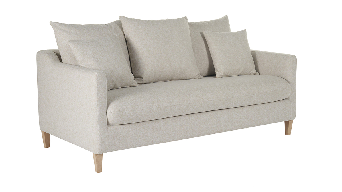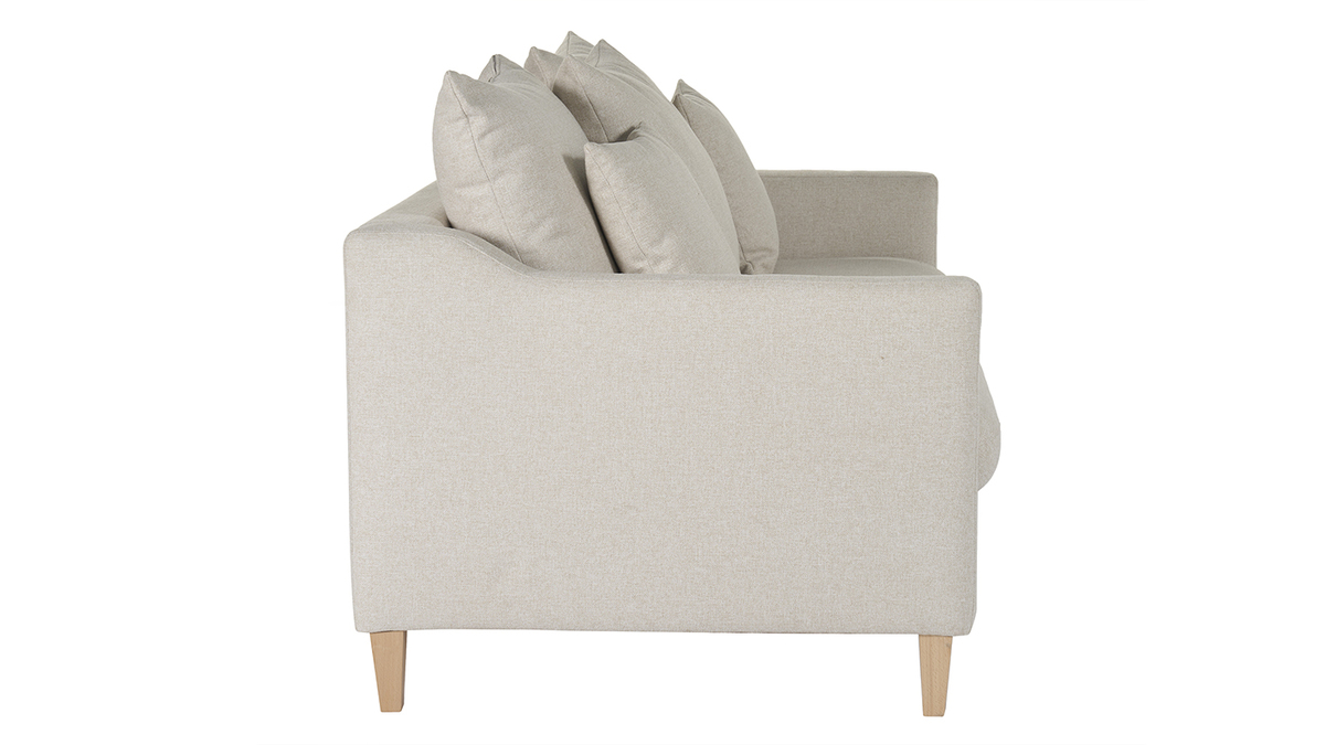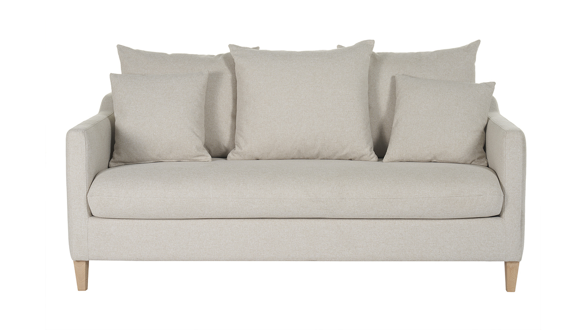 Canapé beige et bois clair livré prêt à monter. Montage simple, seuls les pieds sont à fixer. Le colis étant volumineux, nous vous conseillons de vérifier que portes et escaliers permettent son passage.