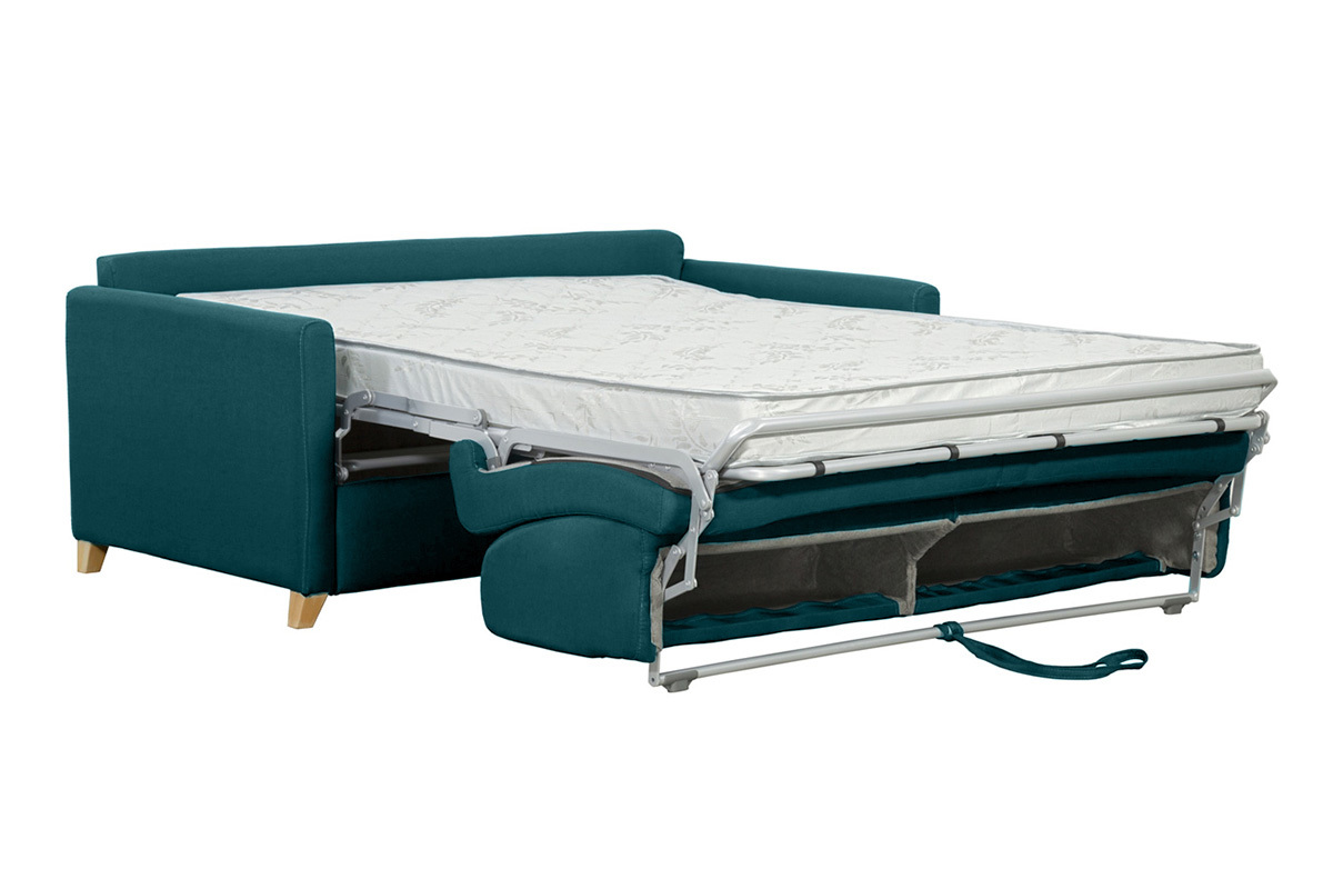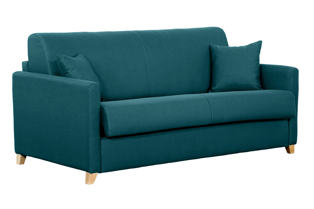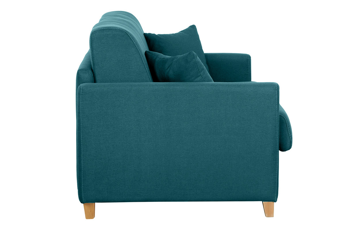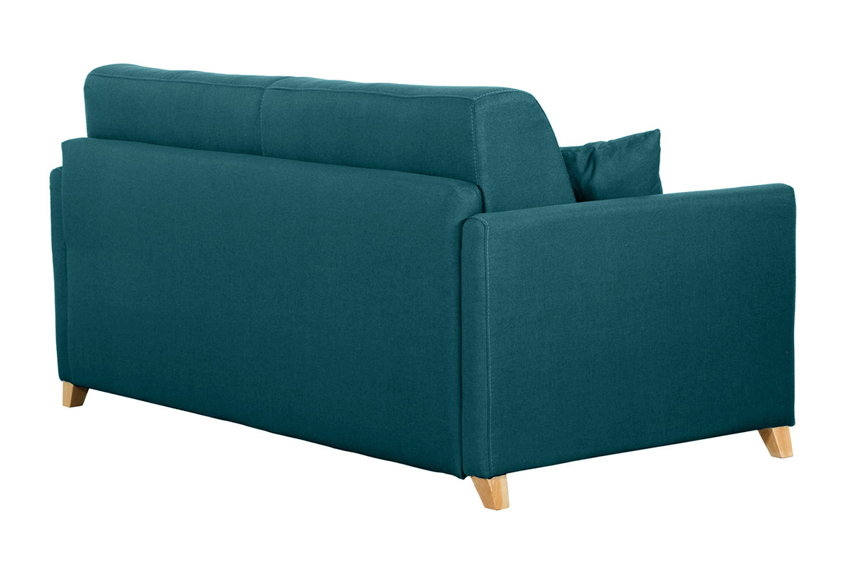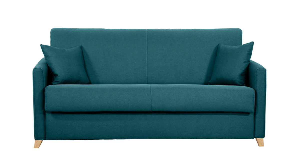 L'atout du canapé convertible bleu paon SKANDY, c'est avant tout son matelas intégré (140 x 190 cm), un véritable lit d'appoint 2 places qui offrira tout le confort nécessaire à vos convives. Il suffit d'abaisser le dossier pour découvrir un agréable couchage pour deux personnes. Grâce à son système express, ce canapé-lit 3 places bleu canard se déplie et reprend sa forme initiale très facilement. Parfaitement adapté aux séjours où chaque m², ce petit canapé convertible (dimensions L176 x P99 x H92 cm) possède également deux espaces de rangement intégrés au dossier.