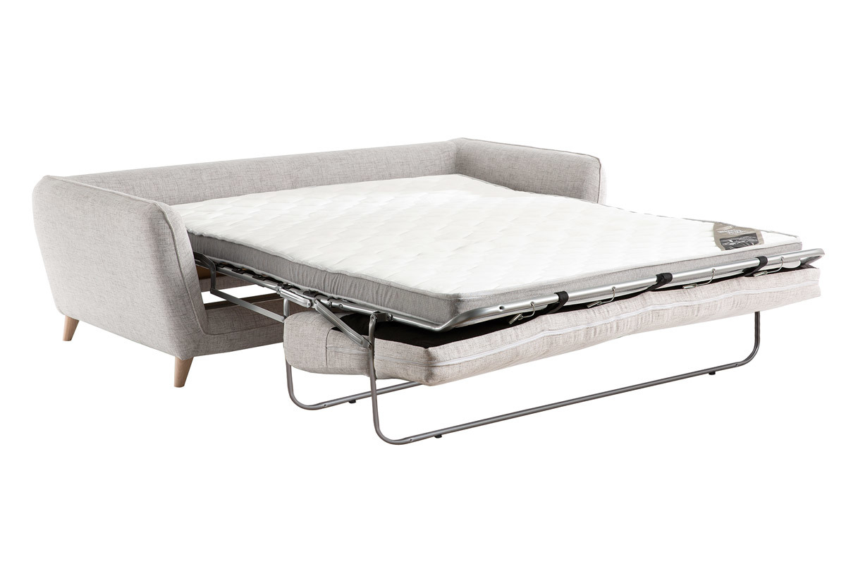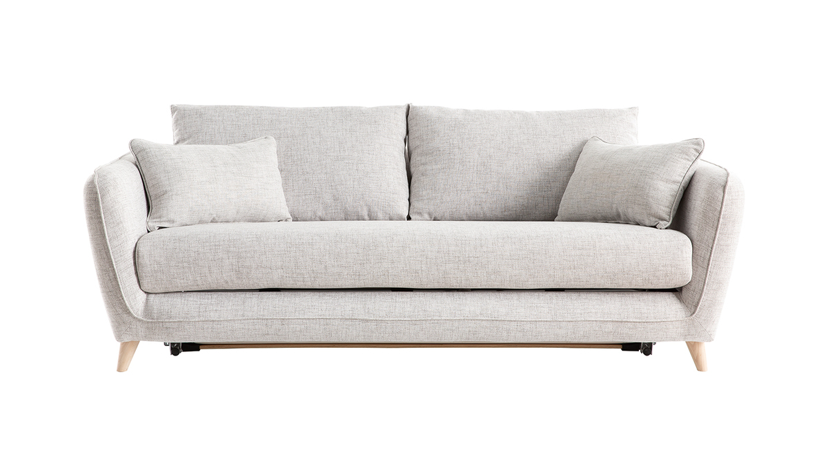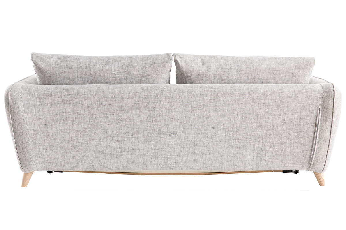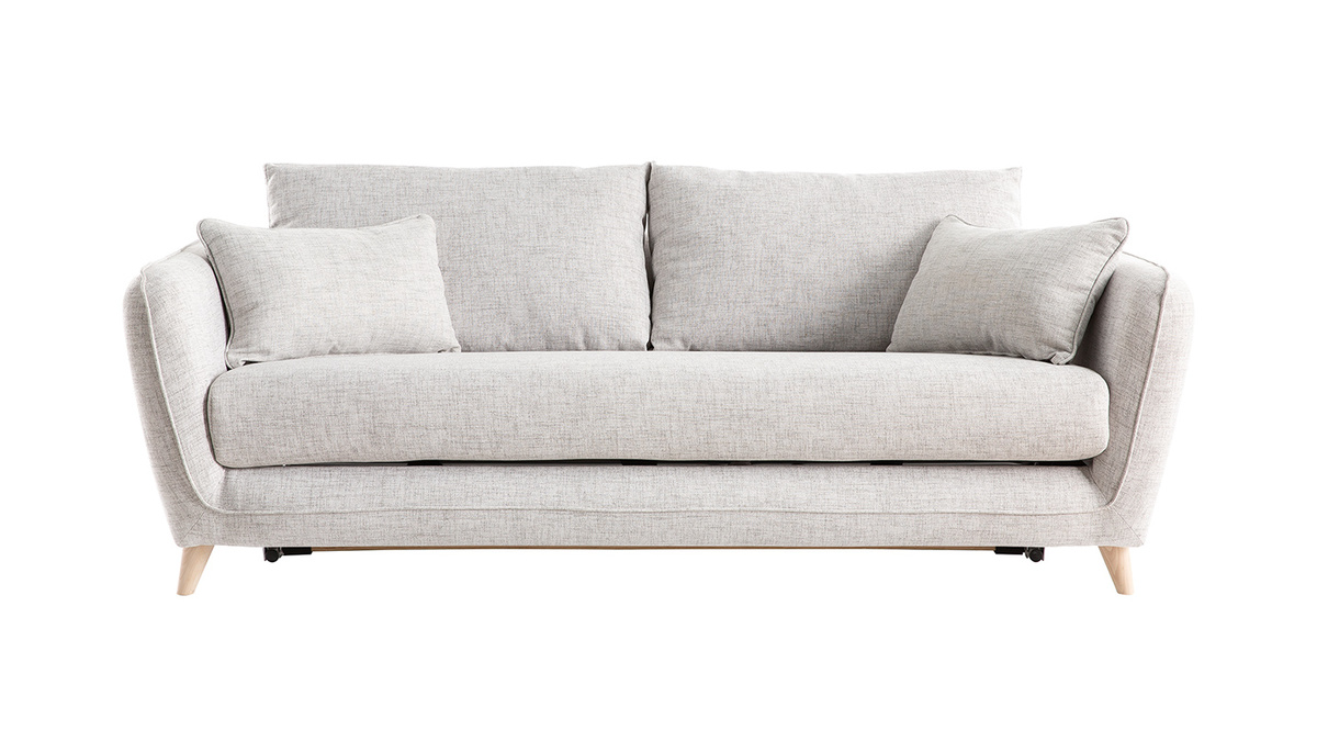 Ce canapé-lit 3 places gris clair est habillé d'un tissu déperlant qui limite l'absorption et la pénétration des taches. Les liquides glissent sur la surface du tissu et forment des gouttes que vous pourrez enlever facilement à l'aide d'un chiffon doux.