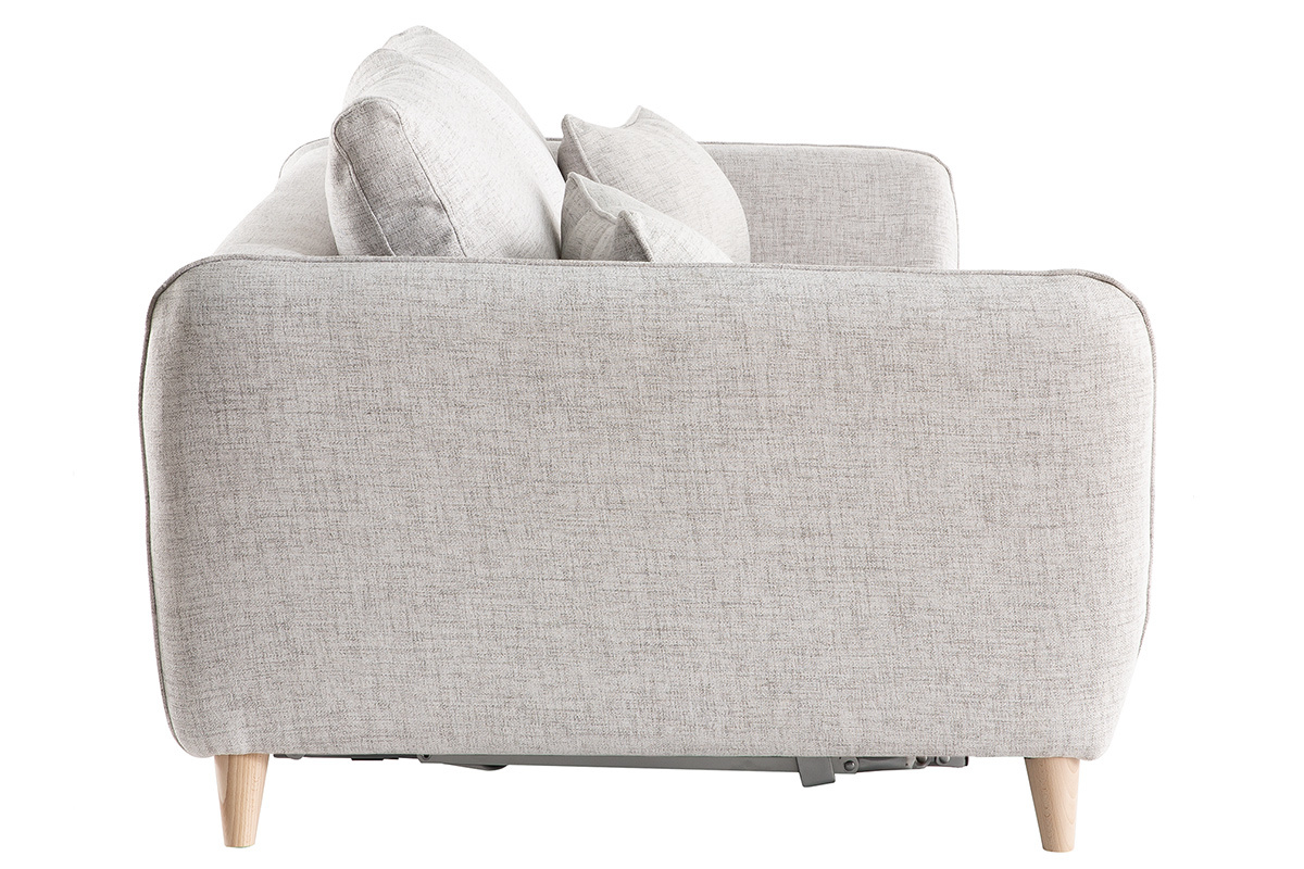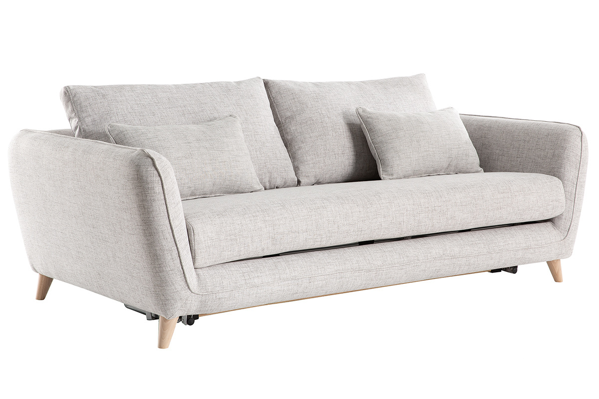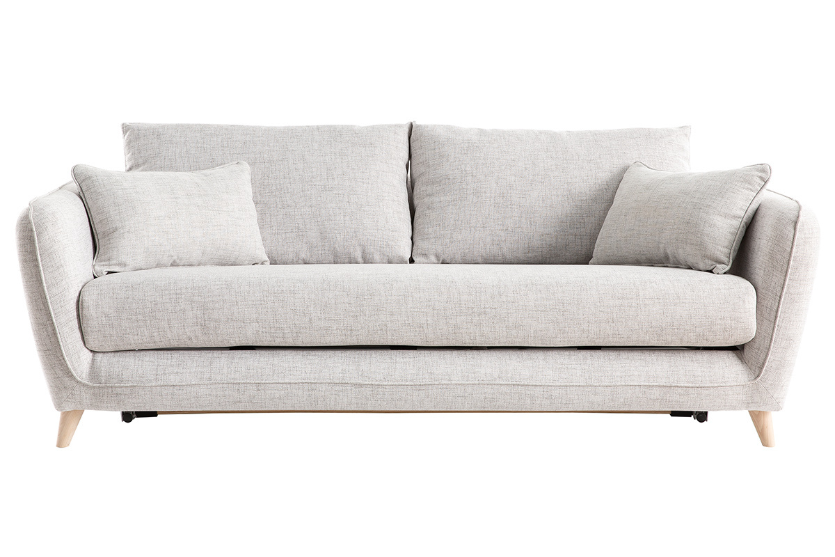 Ce canapé-lit 3 places gris clair est habillé d'un tissu déperlant qui limite l'absorption et la pénétration des taches. Les liquides glissent sur la surface du tissu et forment des gouttes que vous pourrez enlever facilement à l'aide d'un chiffon doux.