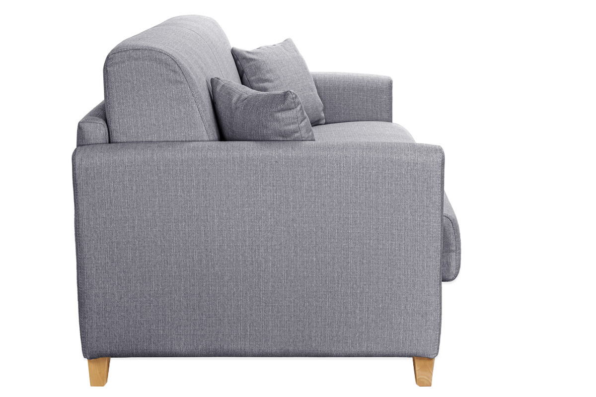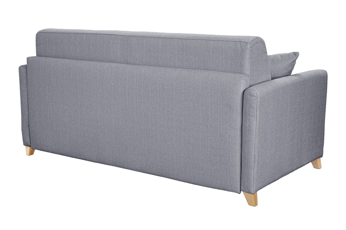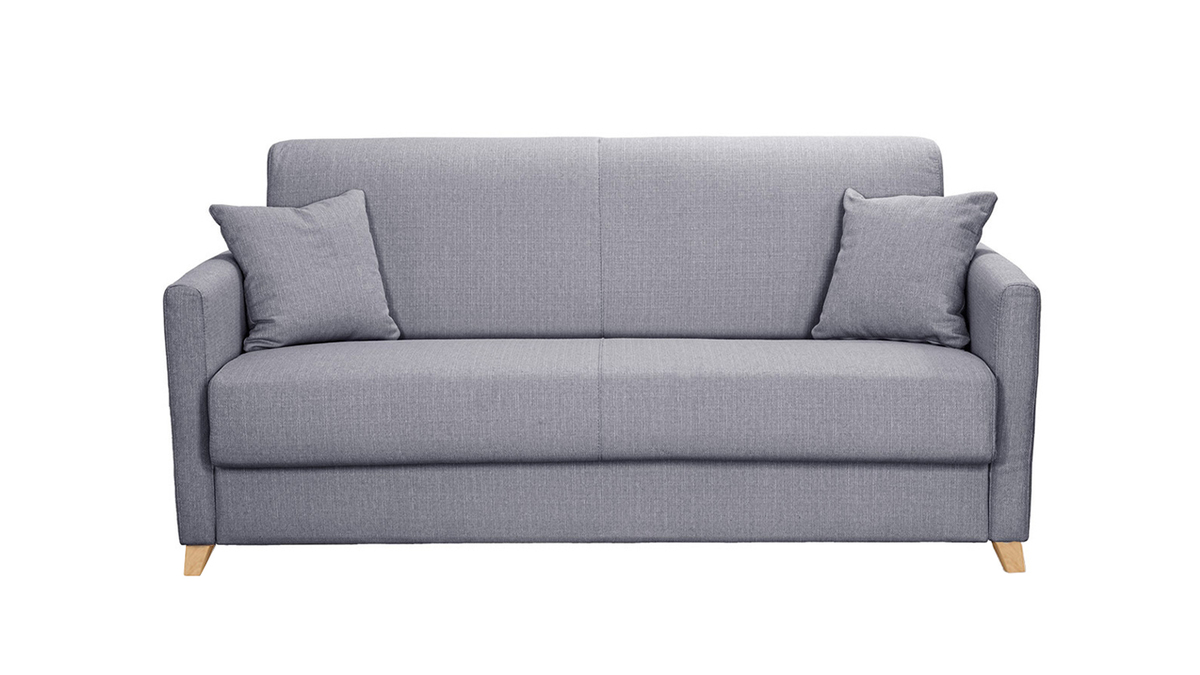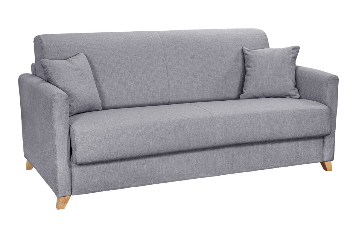 L'atout du canapé convertible gris clair SKANDY, c'est avant tout son matelas intégré (140 x 190 cm), un véritable lit d'appoint 2 places qui offrira tout le confort nécessaire à vos convives. Il suffit d'abaisser le dossier pour découvrir un agréable couchage deux personnes. Grâce à son système express, ce canapé-lit 3 places gris clair se déplie et reprend sa forme initiale très facilement. Parfaitement adapté aux séjours où chaque m², ce petit canapé convertible (dimensions L176 x P99 x H92 cm) possède également deux espaces de rangement intégrés au dossier.