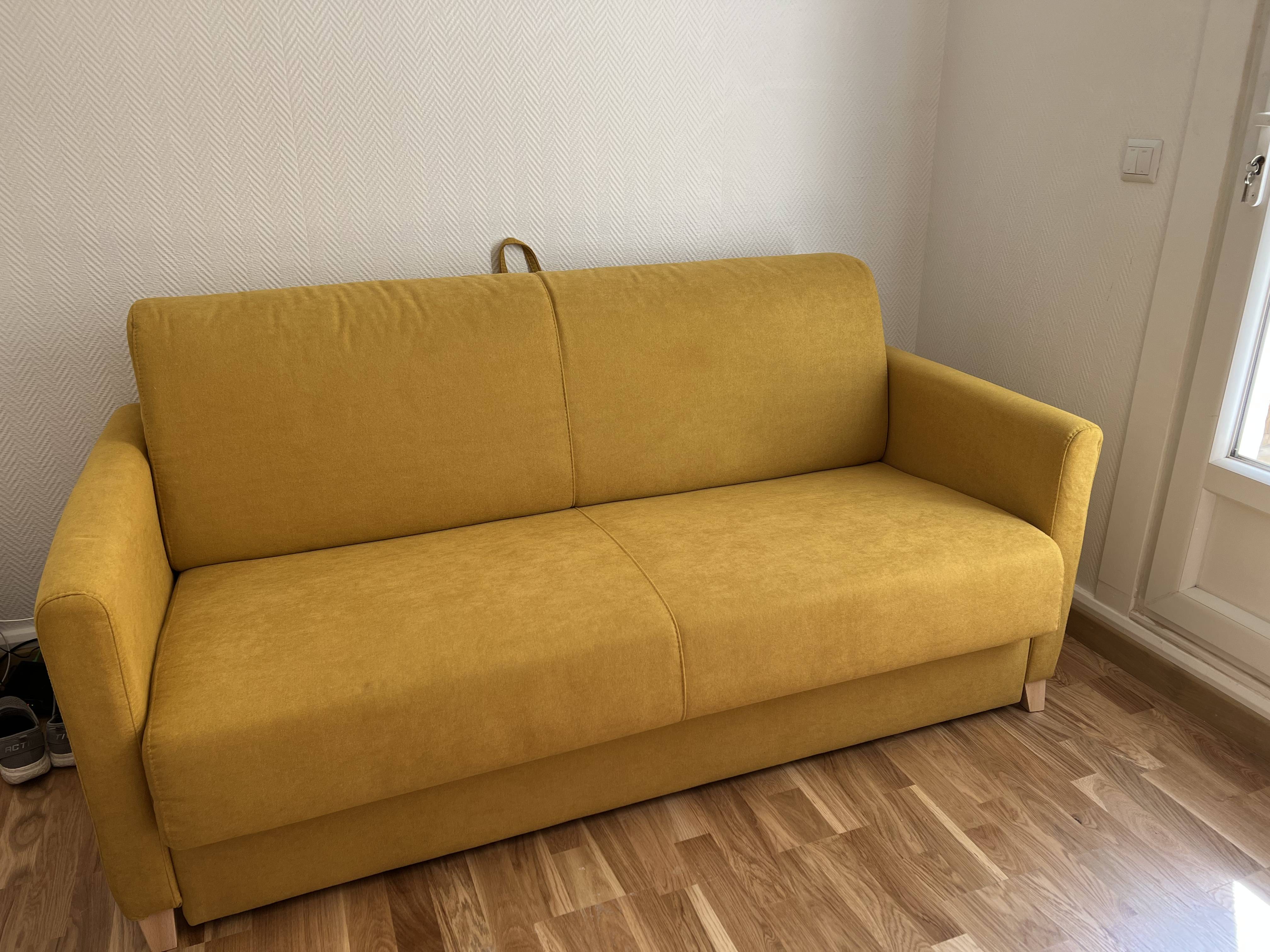Le canapé-lit 3 places SKANDY c'est aussi un joli look moderne et une couleur vibrante et lumineuse. Pour un salon à l'ambiance cosy, optez pour une table basse en bois et un grand tapis berbère.