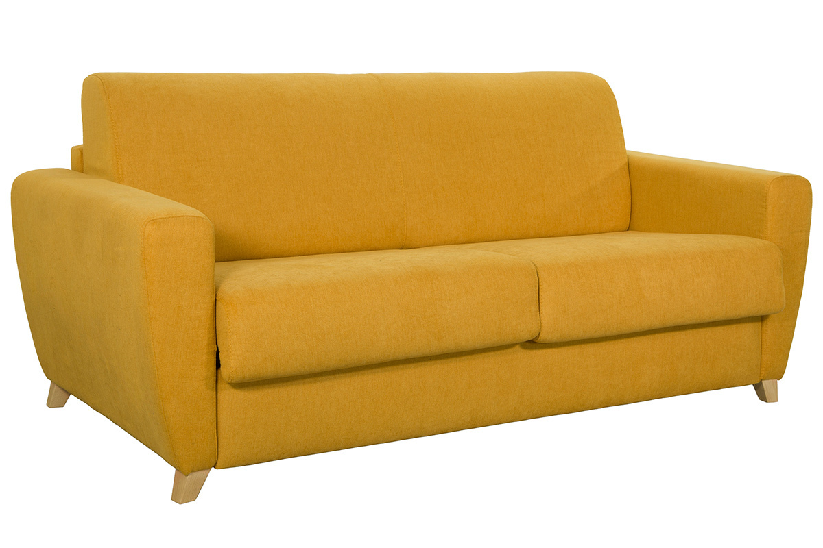 Avec son revêtement en tissu effet velours jaune moutarde, son piètement en bois clair et sa forme tout en rondeur, le canapé GRAHAM offre un rendu chaleureux qui rappelle le mobilier nordique. Sa teinte chic et lumineuse permet d'intégrer cette assise dans différents styles déco : pour un salon 100 % scandinave, accompagnez-le d'une jolie table basse en bois. Pour un séjour contemporain, complétez-le avec une table d'appoint aux matériaux modernes.