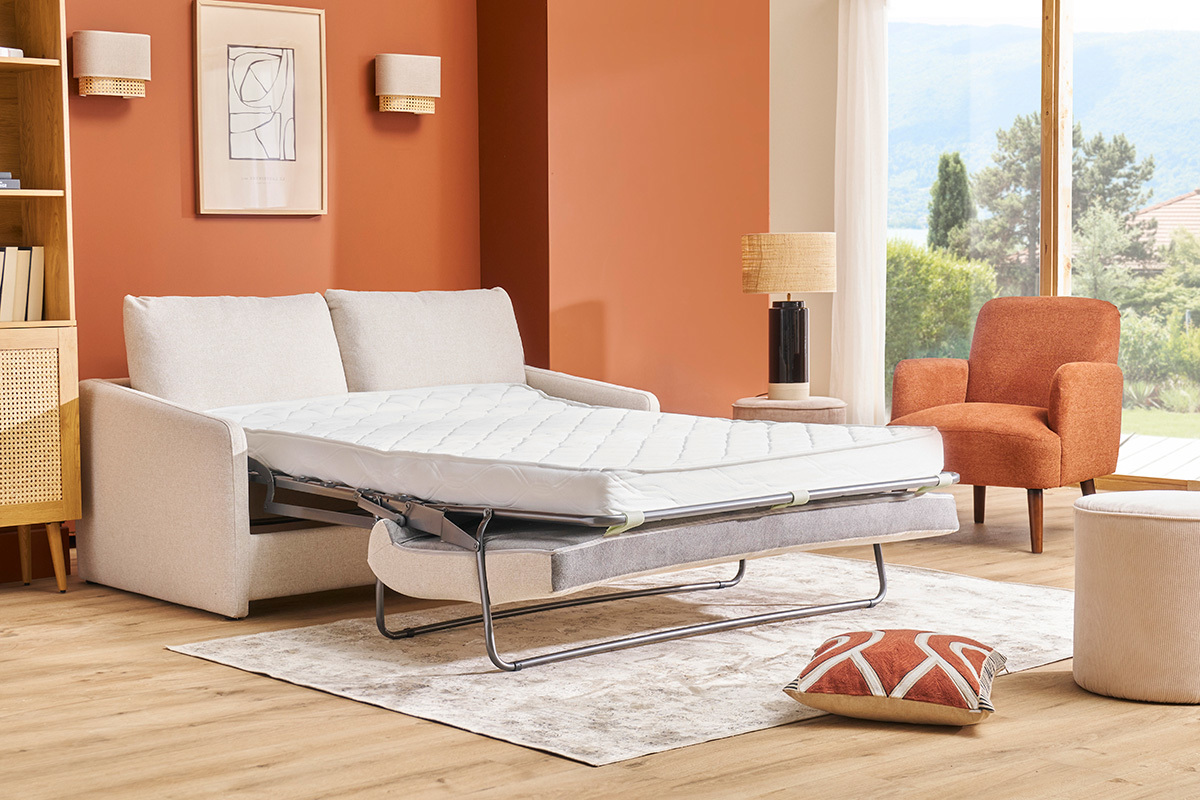 Son design sobre et son coloris neutre lui permettent de s’adapter à tous les styles de décoration, du scandinave au contemporain, en passant par le style bohème ou épuré. Il peut être placé dans un salon principal, une chambre d’amis, un bureau ou un studio, optimisant l’espace sans compromis sur l’élégance et le confort. Compact et fonctionnel, il est idéal pour les petits espaces tout en offrant une solution de couchage pratique.