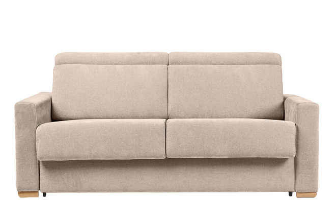 Le canapé convertible NORO en tissu effet velours beige allie avec brio confort et style. Optez pour des tables gigognes pour l'accompagner : faciles à déplacer, elles pourront servir de chevets la nuit.