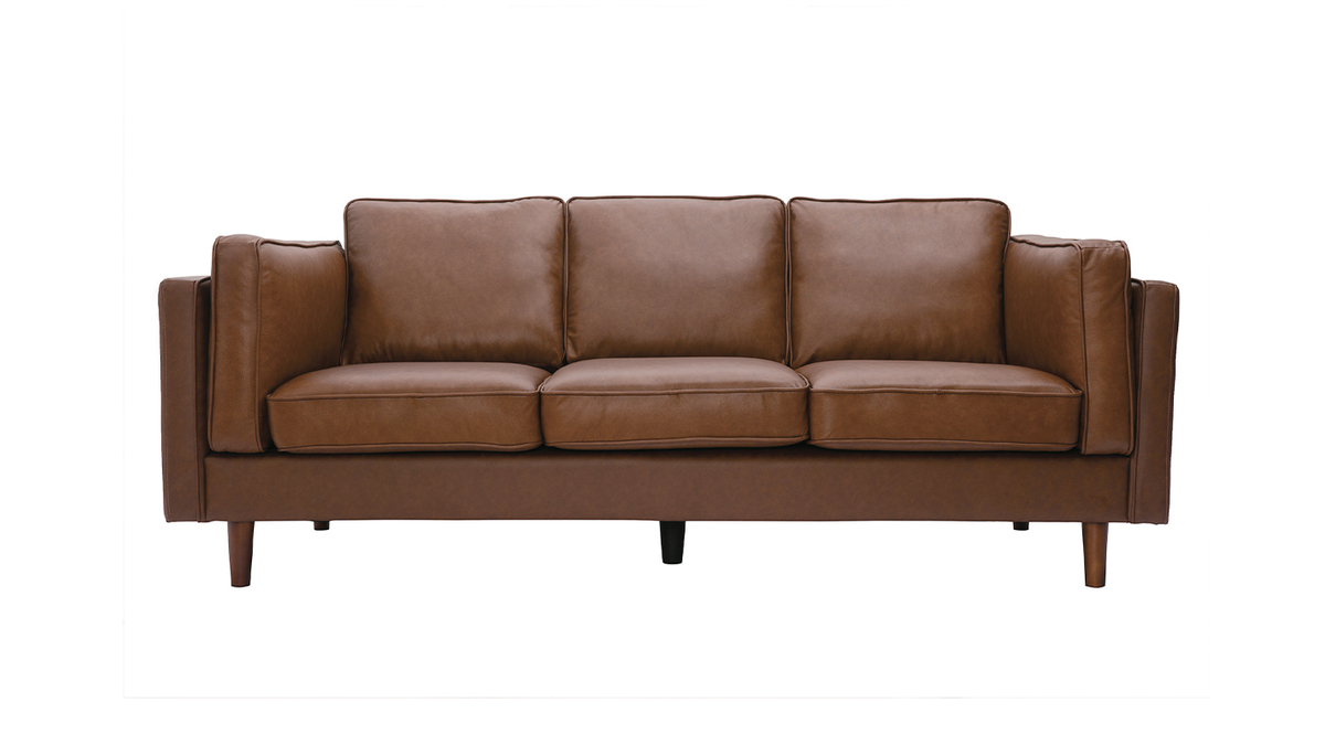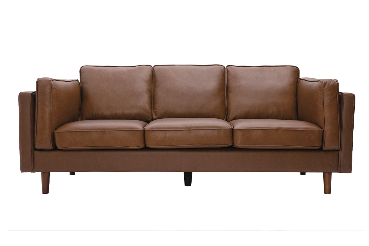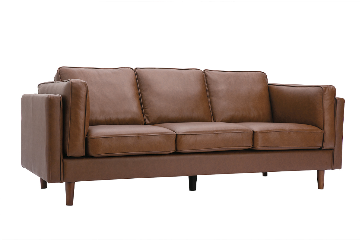Ce canapé 3 places est la synthèse parfaite de l'élégance du confort. Il se compose d'une solide structure en bouleau et d'un joli piétement en chêne massif qui fait référence au mobilier des années 50. L'assise, le dossier et les accoudoirs internes sont habillés d'un magnifique cuir marron. Ce revêtement souple et doux au toucher met en valeur les lignes essentielles du canapé.