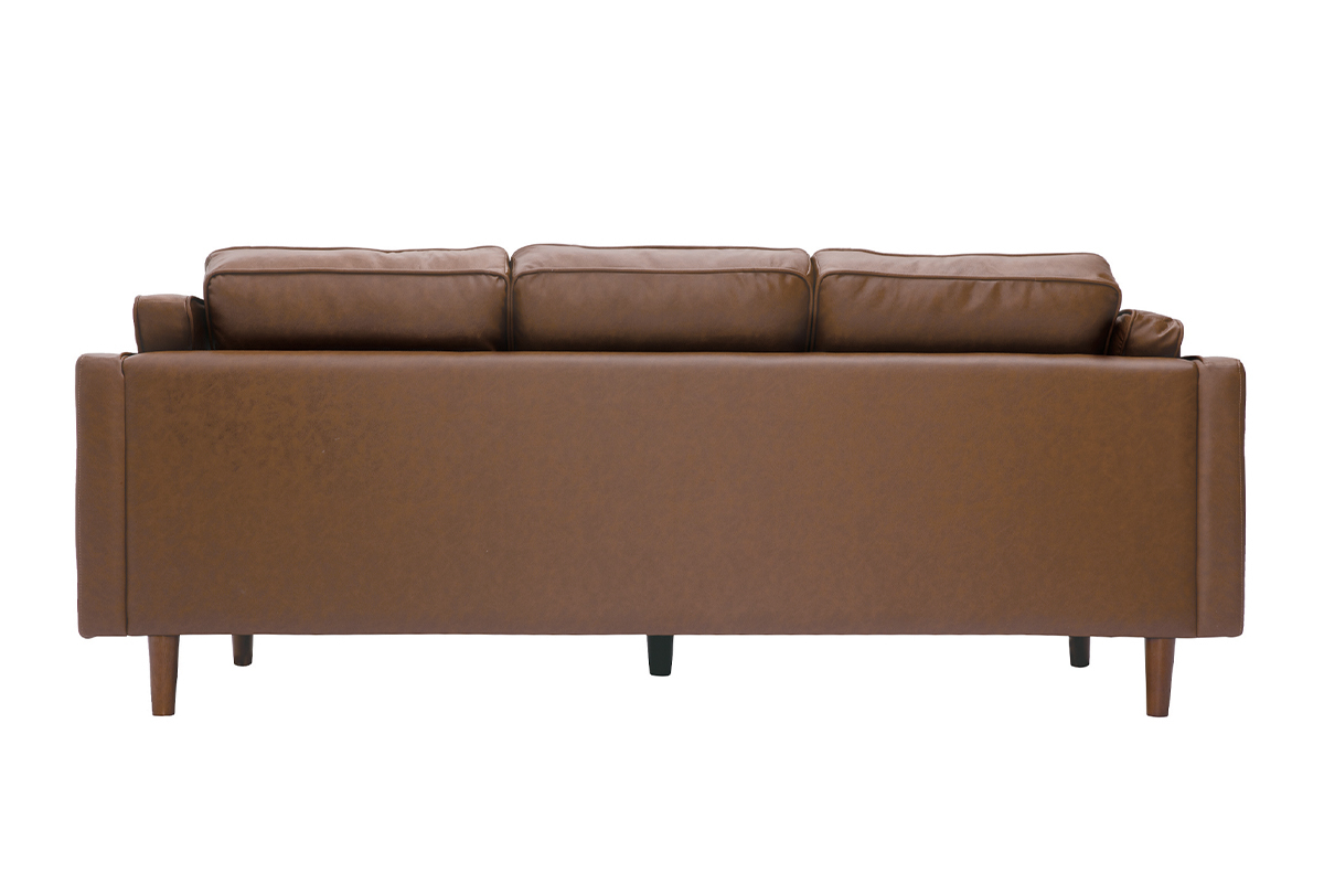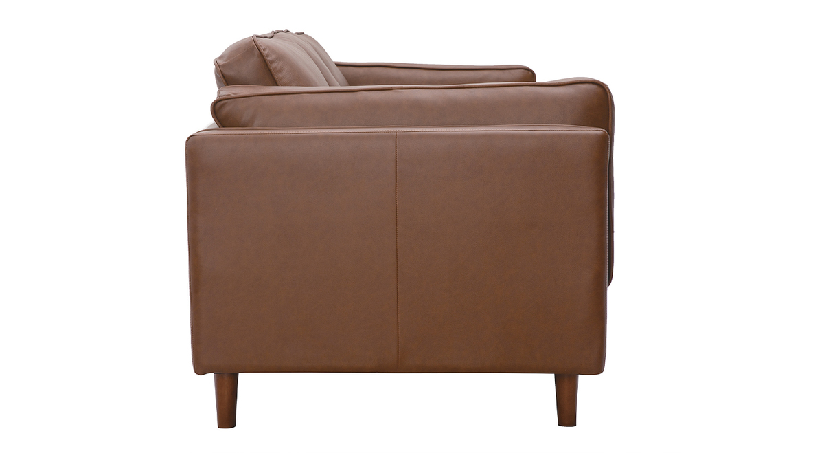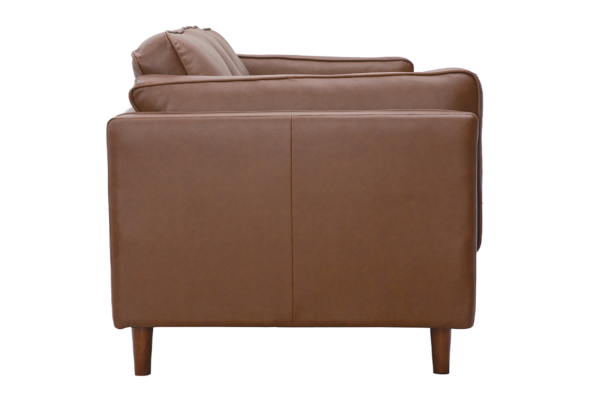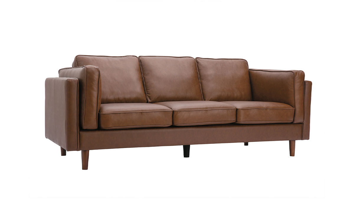 Ce canapé 3 places est la synthèse parfaite de l'élégance du confort. Il se compose d'une solide structure en bouleau et d'un joli piétement en chêne massif qui fait référence au mobilier des années 50. L'assise, le dossier et les accoudoirs internes sont habillés d'un magnifique cuir marron. Ce revêtement souple et doux au toucher met en valeur les lignes essentielles du canapé.