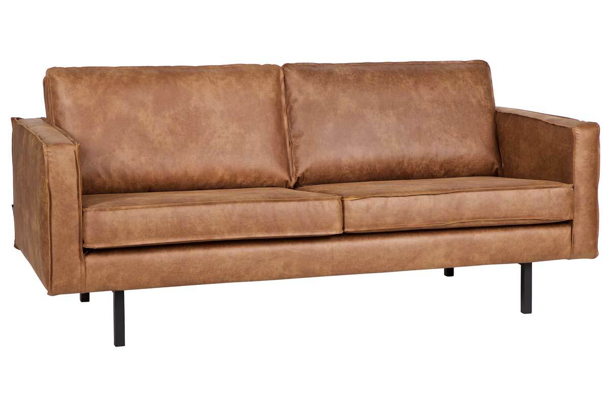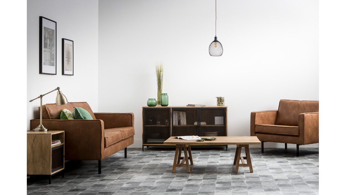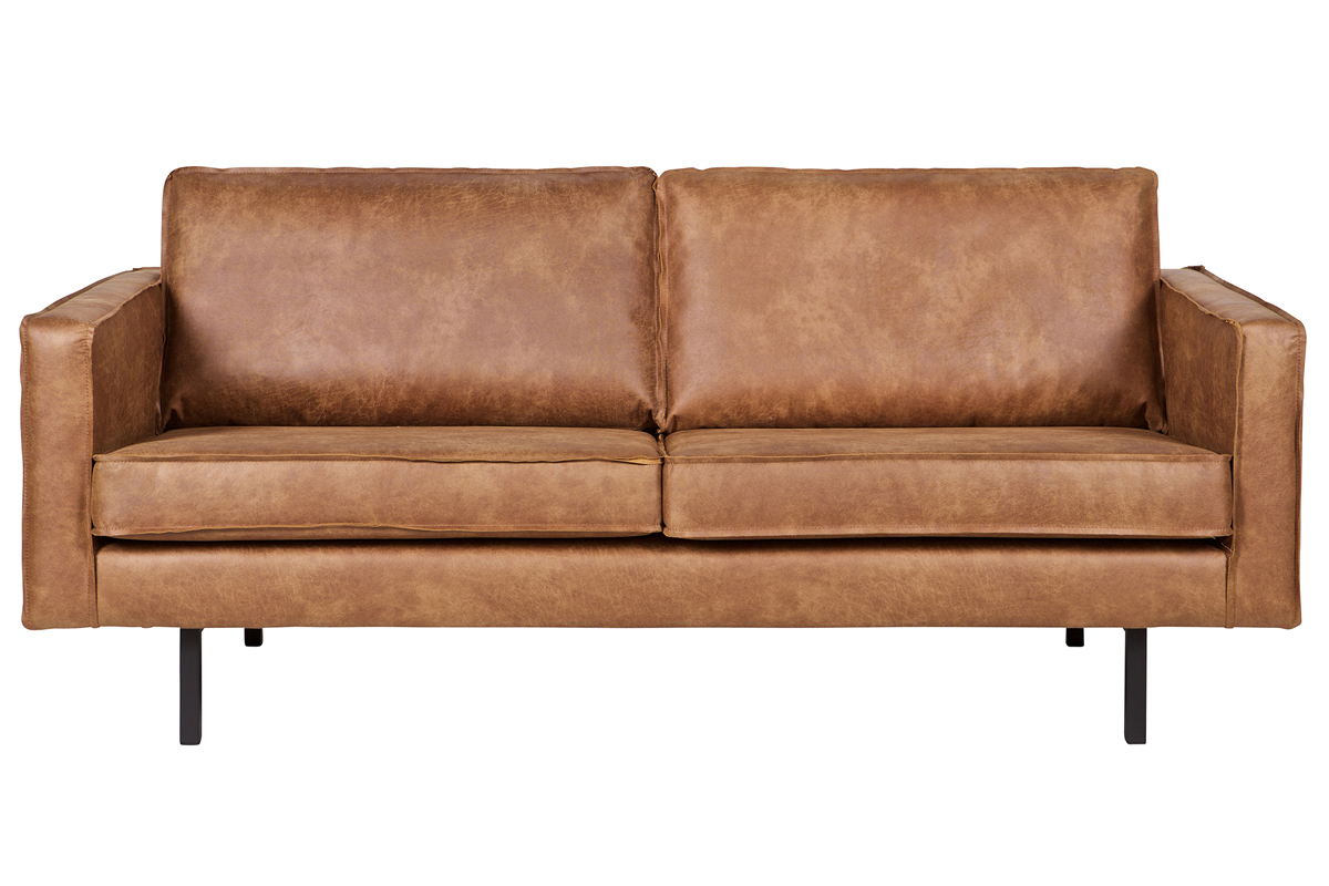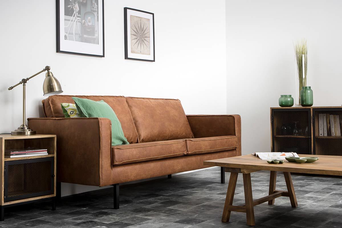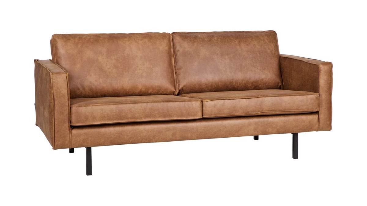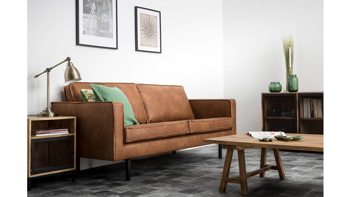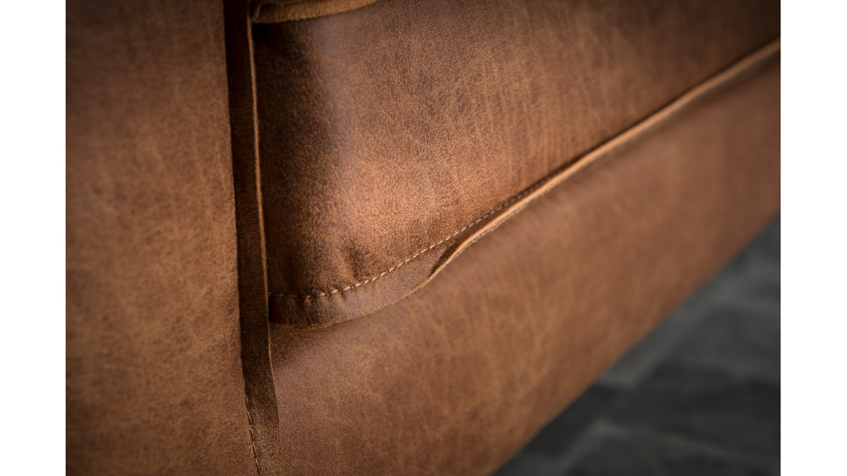 En cuir de vache reconstitué, ce canapé marron à l'aspect vieilli tire son inspiration de l'univers industriel. En effet, ses lignes directrices associées à un revêtement en cuir et un piètement en métal offrent un look complètement "factory".