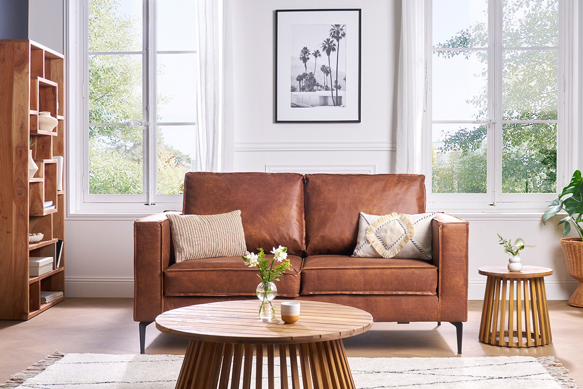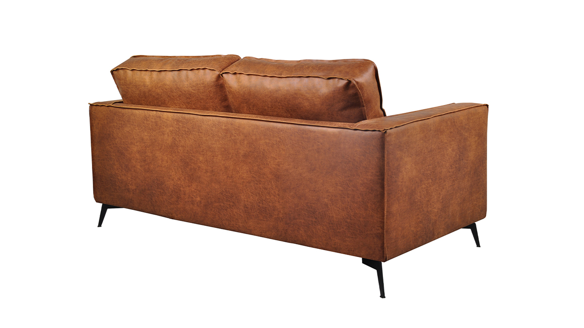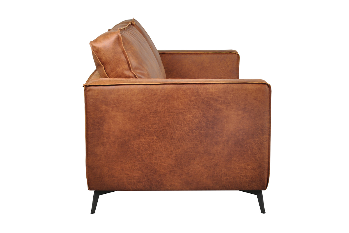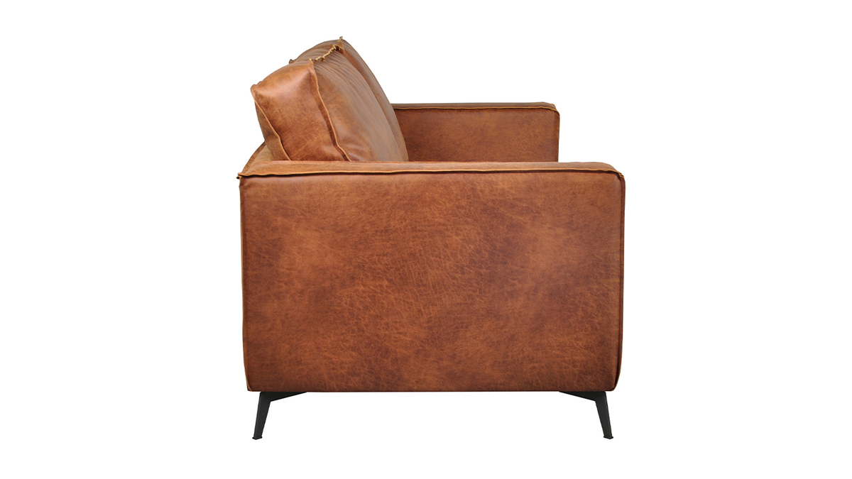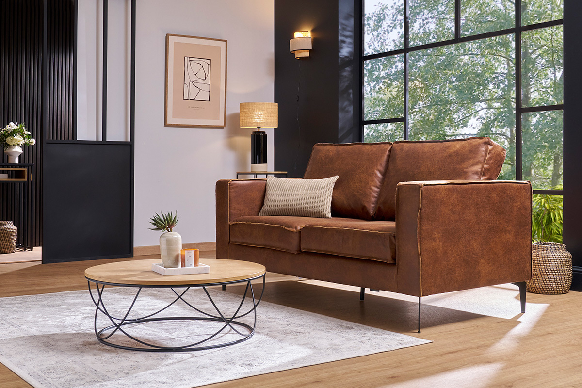 Tout le charme du canapé SONNY réside dans son revêtement en cuir de vache reconstitué à l'aspect vieilli, faussement usé. Donnant cette impression d'avoir été patiné par le temps, ce canapé marron cognac est une belle pièce de caractère qui fera toute la différence dans votre salon. Pour parfaire son look authentique, ce canapé vintage repose sur des pieds en métal noir.