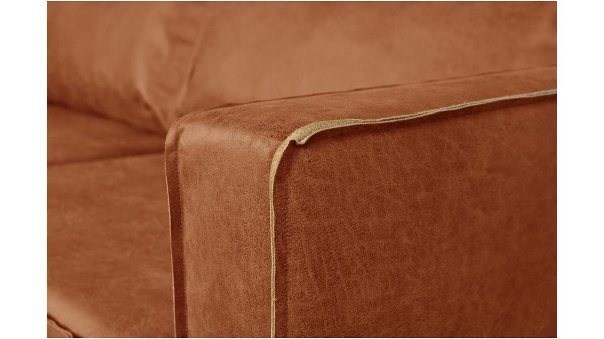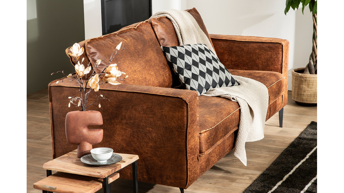 Le canapé SONNY est habillé d'un magnifique revêtement en cuir de vache reconstitué qui semble patiné par le temps. Souple et doux au toucher, il met en valeur les lignes essentielles du canapé et lui donne un superbe effet vintage.
