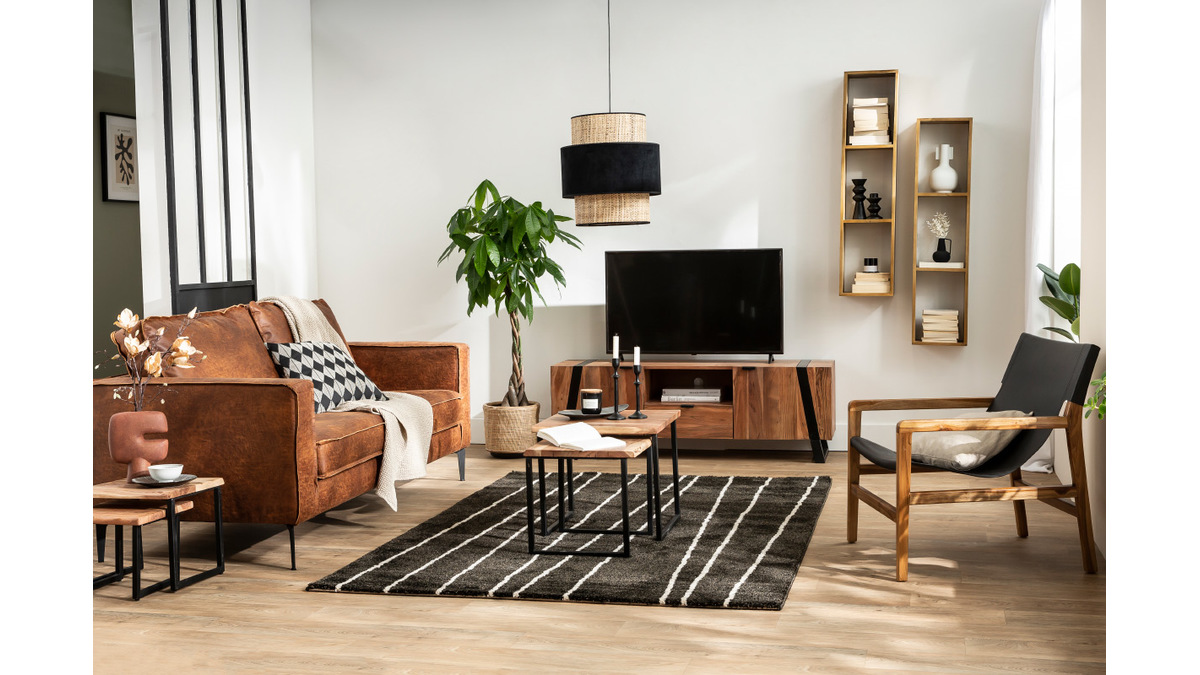 SONNY est un canapé vintage à la beauté brute, singulière et affirmée. Il s'intègre aussi bien dans une pièce de vie à la décoration ethnique chic que dans un séjour au style loft industriel. Allié des petits espaces, ce petit canapé qui mesure 193 cm de long pourra accueillir confortablement jusqu'à 3 personnes. Il associe une solide structure en bois de pin, hêtre et aggloméré (panneaux de particules et de fibres de bois) à des ressorts. Pour un maximum de confort, les coussins d'assise sont garnis d'un épais rembourrage qui mixe de la mousse polyuréthane haute résilience (densité 30 kg/m3) et de la ouate (densité 200 g/m2). Les quatre pieds en métal noir renforcent l'esthétique industrielle du canapé.