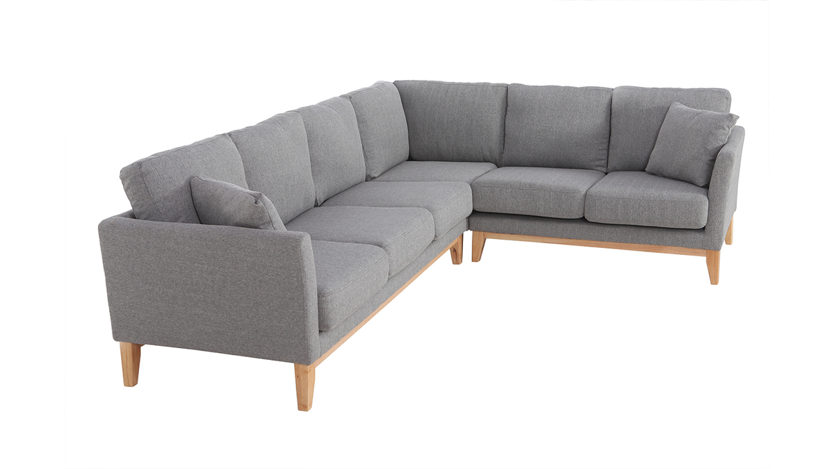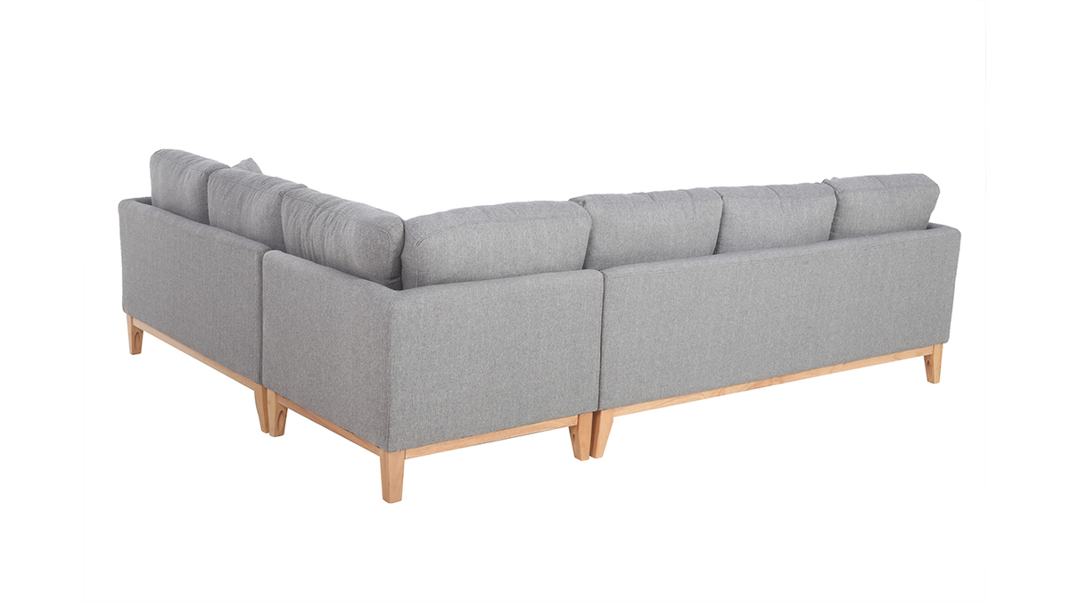 Canapé d'angle déhoussable scandinave 5-6 places en tissu gris clair et bois clair livré prêt à monter. Montage simple, seuls les piètements sont à fixer. Les colis étant volumineux, nous vous conseillons de vérifier que portes et escaliers permettent leur passage.