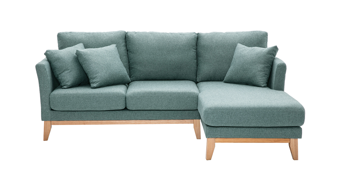 Canapé d'angle droit déhoussable scandinave en tissu vert de gris et bois clair 4 places OSLO livré prêt à assembler. Montage simple, seuls les pieds sont à fixer. Les colis étant volumineux, nous vous conseillons de vérifier que portes et escaliers permettent leur passage.