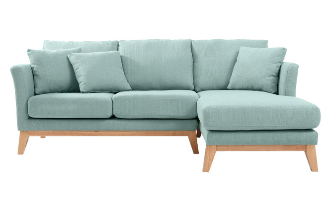 Canapé d'angle droit déhoussable scandinave en tissu vert lagon et bois clair 4 places OSLO livré prêt à assembler. Montage simple, seuls les pieds sont à fixer. Les colis étant volumineux, nous vous conseillons de vérifier que portes et escaliers permettent leur passage.