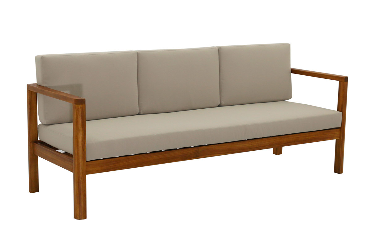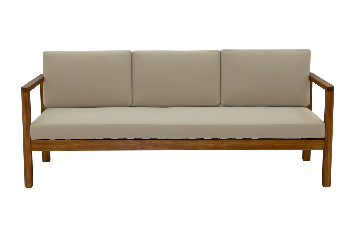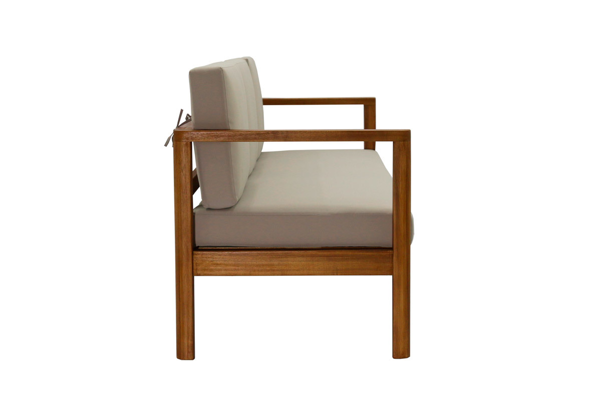 Parfait pour des moments farniente, ce canapé d'extérieur en bois massif gagne en volume et en douceur grâce aux deux grands coussins garnis d'une mousse densité 20 kg/m³. Lignes sobres et assumées, teintes neutres mais raffinées, tandem de charme intemporel, bois naturel chaleureux et coloris taupe contrastent pour un résultat à la fois simple et chic.