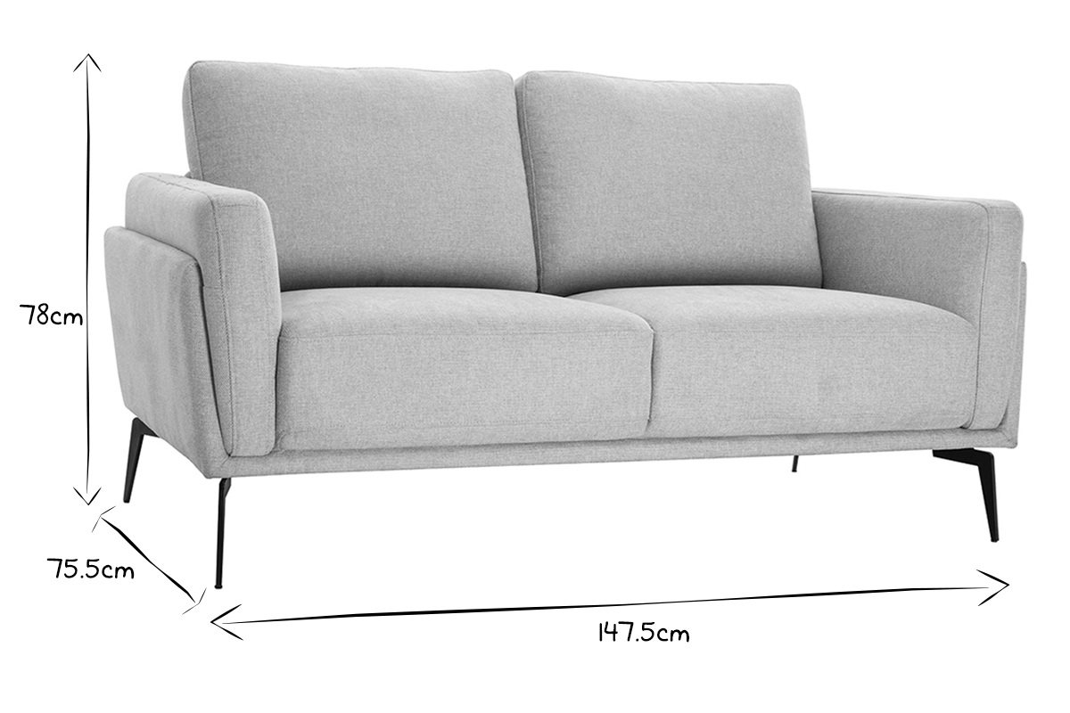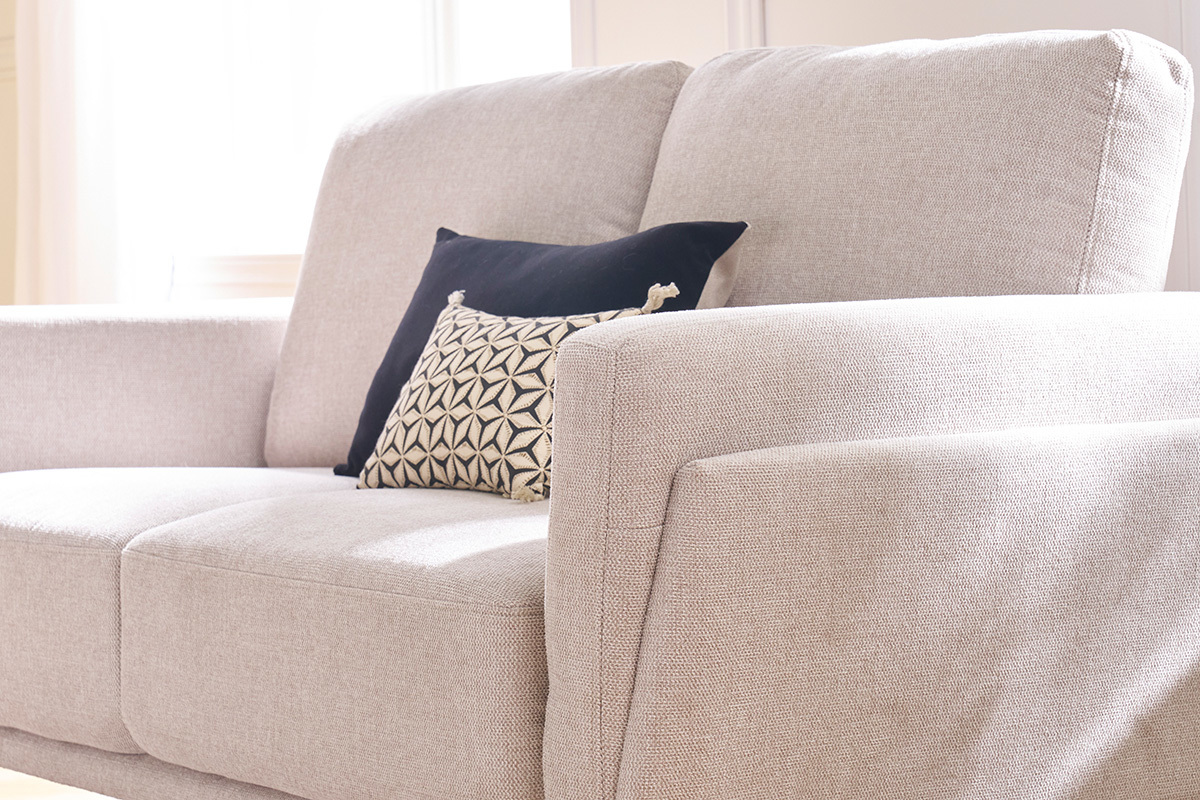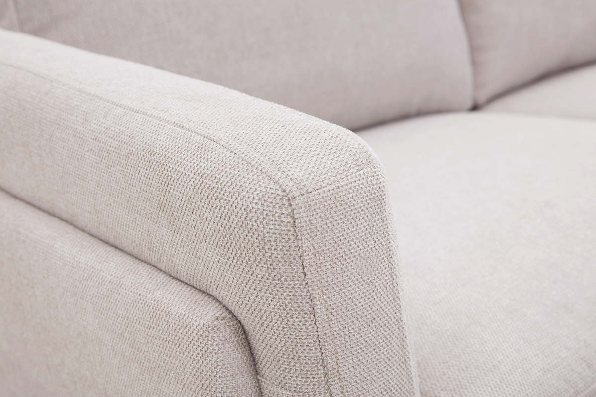 Canapé en tissu beige naturel 2 places livré prêt à monter. Montage simple, seul le piètement est à fixer.