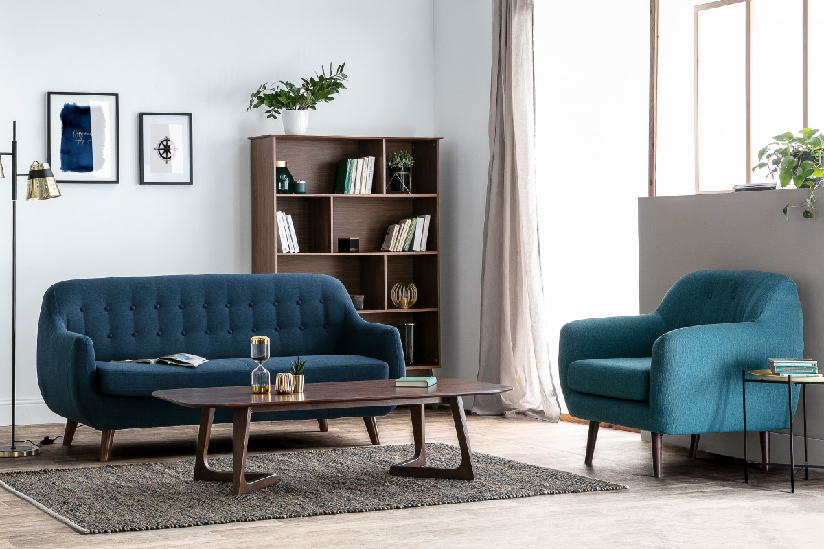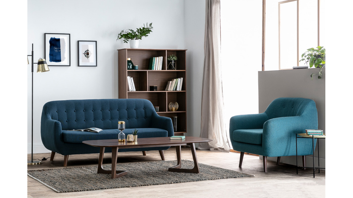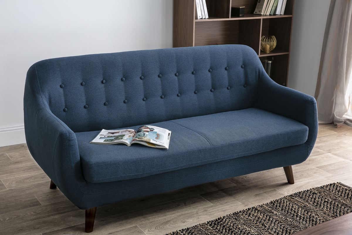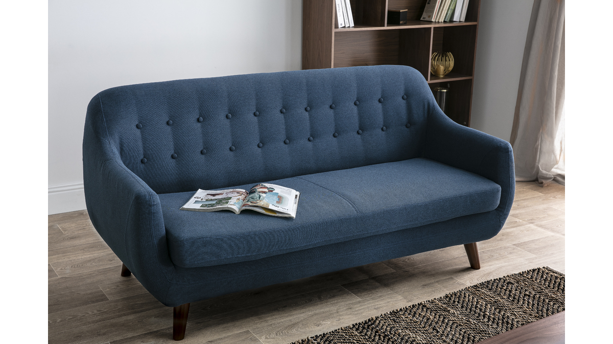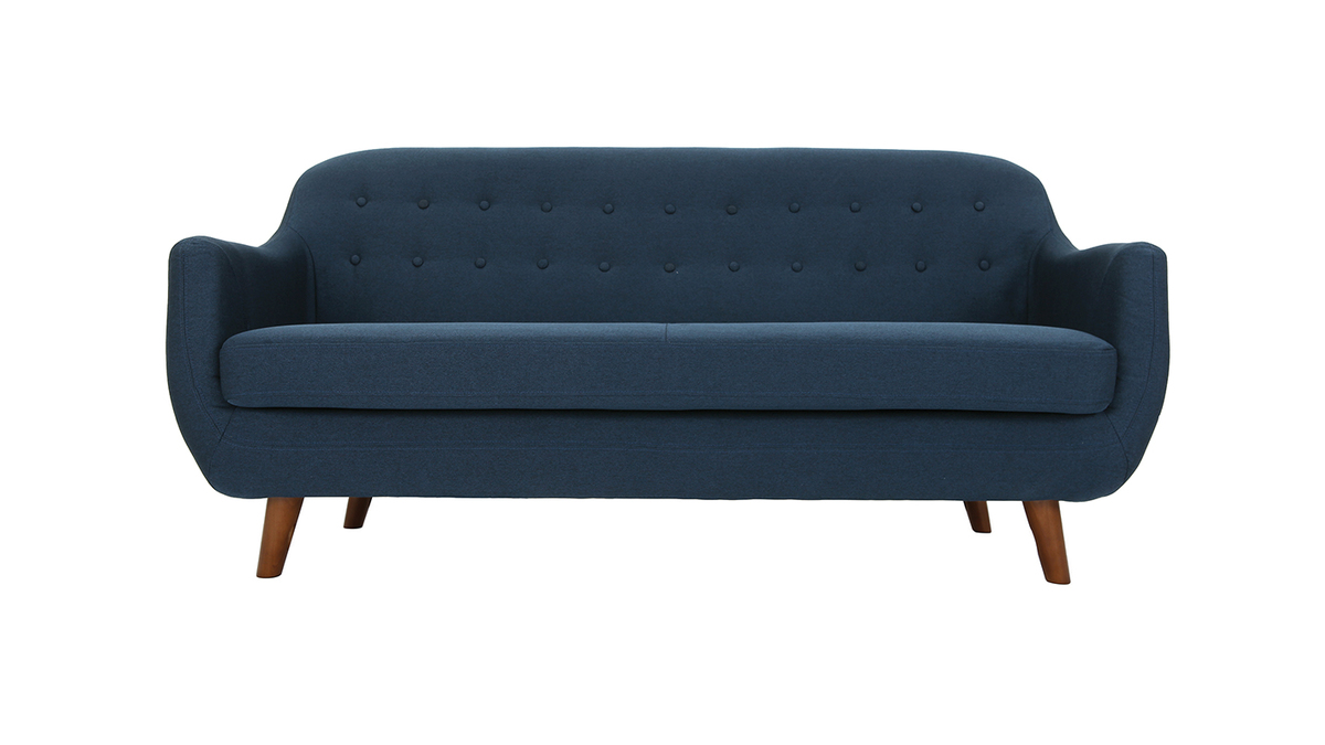 Dossier capitonné, revêtement en tissu bleu foncé associé à un pietement en hévéa massif teinté noyer, toutes ces caractéristiques sont présentes pour apporter du raffinement à ce canapé. Formes très allégées quasi aériennes, ce canapé YNOK saura sublimer votre intérieur comme nul autre.