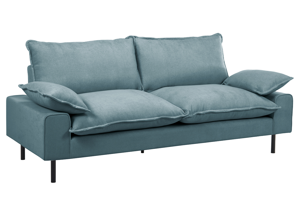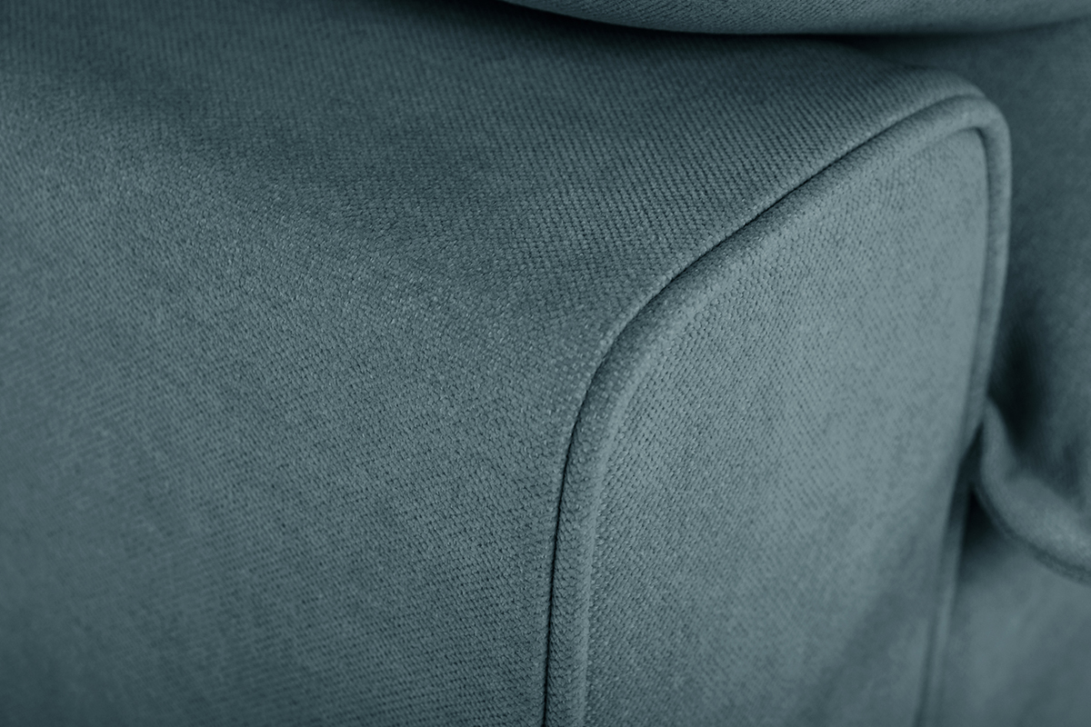 Sa couleur bleu gris - à la fois lumineuse et chaleureuse - lui vaut son style raffiné, capable de donner beaucoup de caractère à n'importe quel intérieur. La beauté du tissu effet velours, aussi doux au regard qu'au toucher, est mise en valeur par des lignes rebondies et la sobriété des pieds en métal noir. Un sans-faute !
