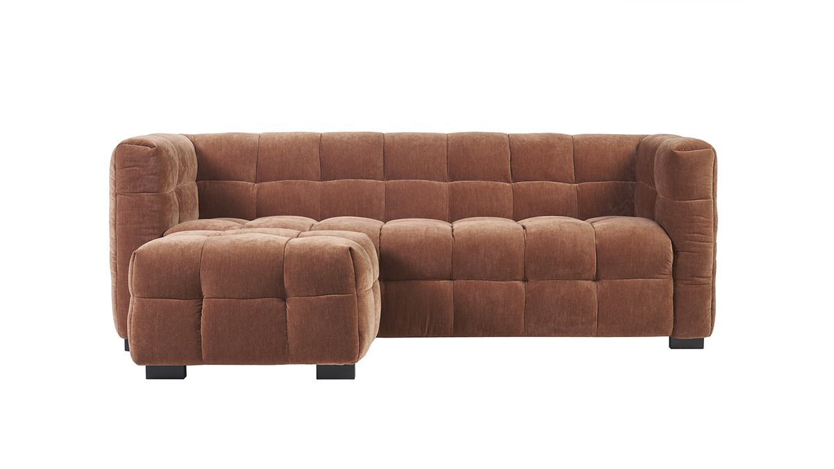 Garnis d'une agréable mousse, canapé et repose-pieds en tissu terre brûlée s'habillent d'un revêtement effet velours. Une trame aussi agréable à l'oeil qu'au toucher qui épouse parfaitement les volumes bien galbés de ce joli tandem !