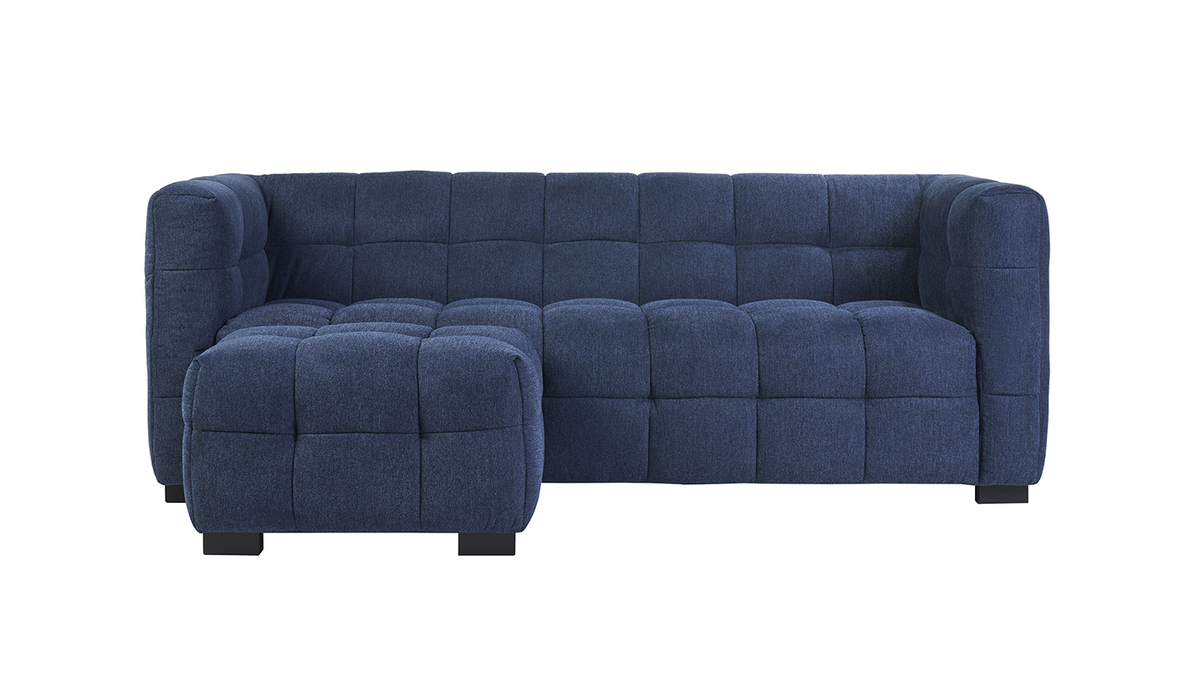 Canapé design 3 places et repose-pieds en tissu effet velours texturé bleu foncé CORTO livrés prêts à assembler. Montage simple, seuls les pieds sont à fixer. Le colis du canapé étant volumineux, nous vous conseillons de vérifier que portes et escaliers permettent son passage.