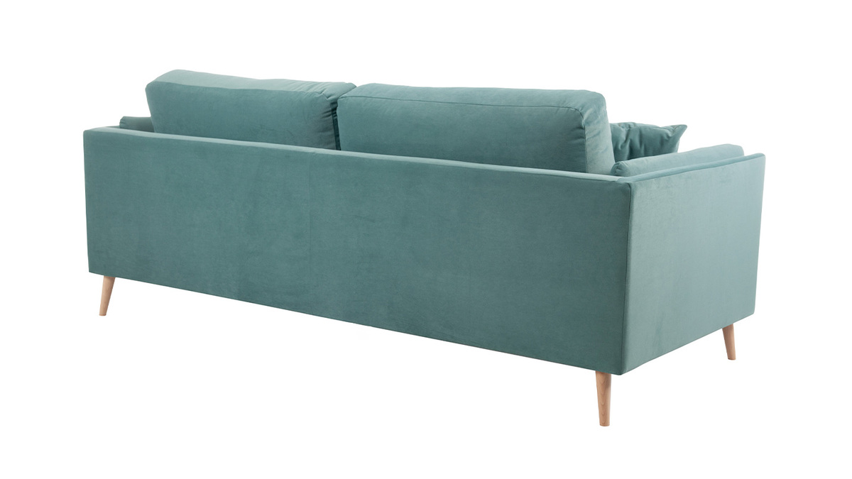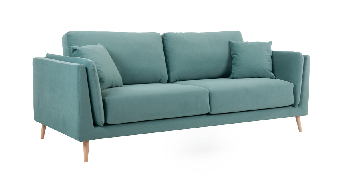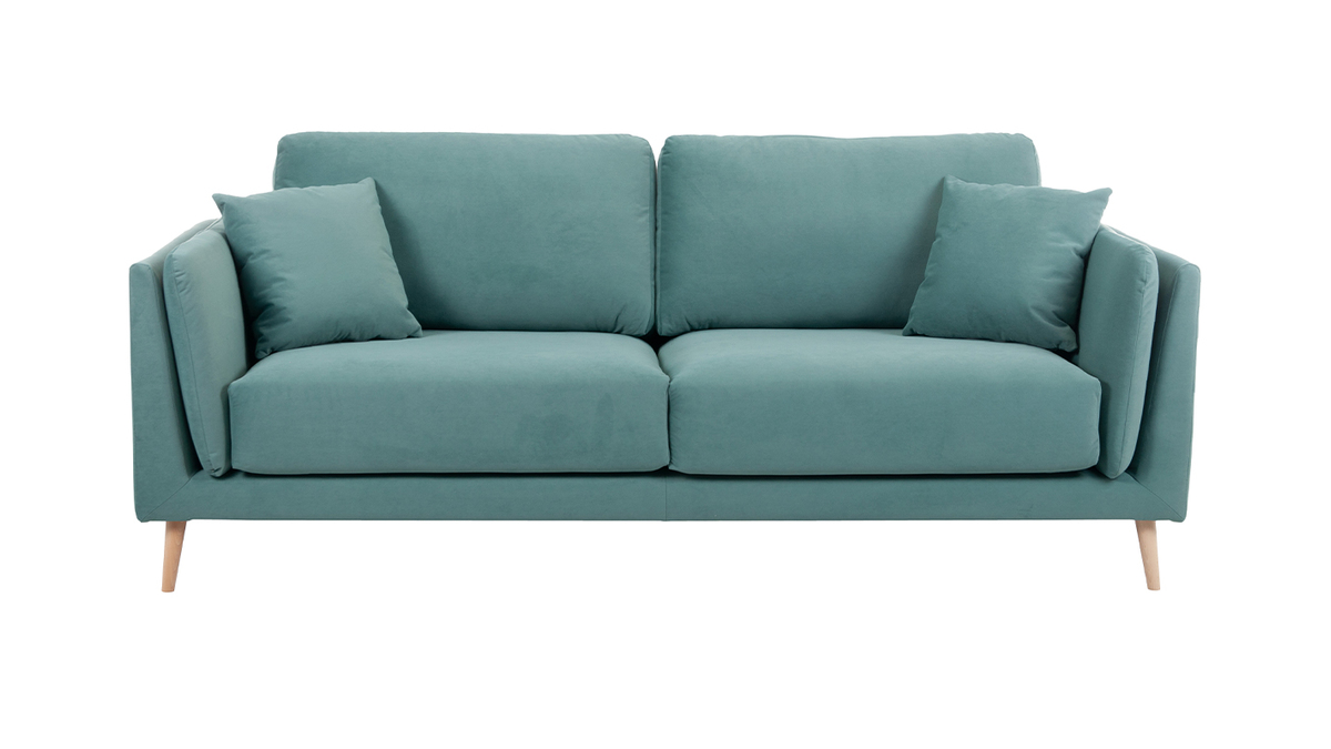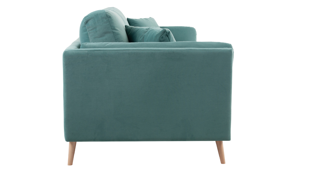 Esthétique, ce canapé en tissu velours bleu glacier et pieds bois est une assise 3 places des plus confortables ! Garnis d'une mousse haute résilience, dossier (densité 25 kg/m³) et assise (densité 30 kg/m³) s'accompagnent de deux petits coussins d'appoint pour garantir le confort d'un canapé ferme. Grâce à sa structure en pin et ses pieds en hêtre massif, ce modèle de canapé confortable est un allié solide pour aménager un salon déco et tout confort.
