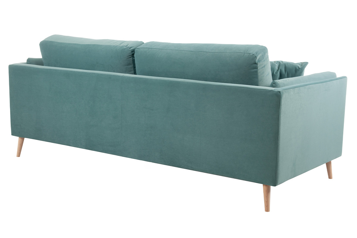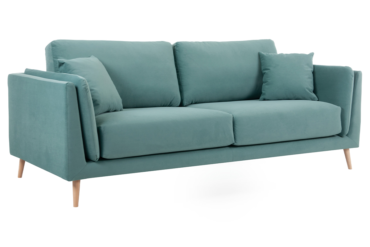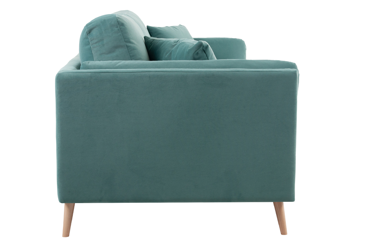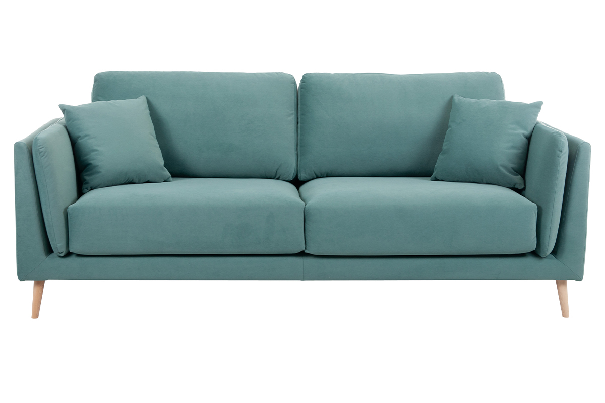 Esthétique, ce canapé en tissu velours bleu glacier et pieds bois est une assise 3 places des plus confortables ! Garnis d'une mousse haute résilience, dossier (densité 25 kg/m³) et assise (densité 30 kg/m³) s'accompagnent de deux petits coussins d'appoint pour garantir le confort d'un canapé ferme. Grâce à sa structure en pin et ses pieds en hêtre massif, ce modèle de canapé confortable est un allié solide pour aménager un salon déco et tout confort.
