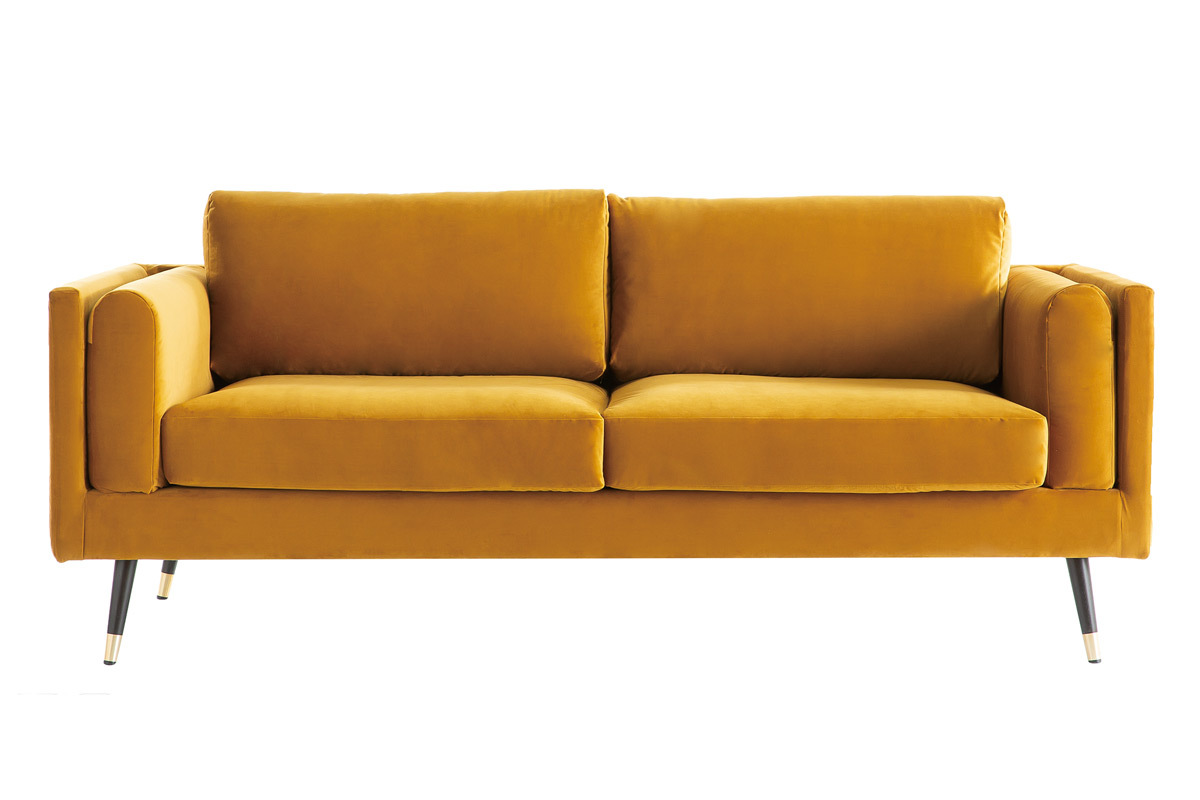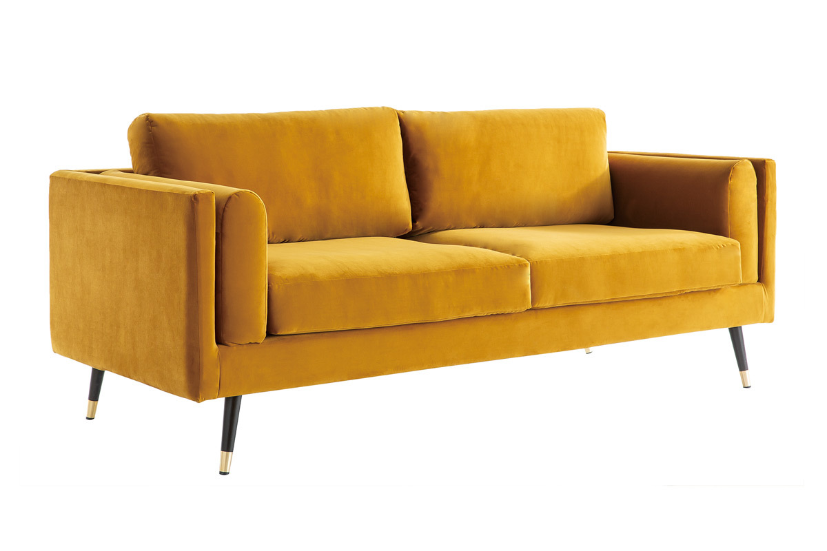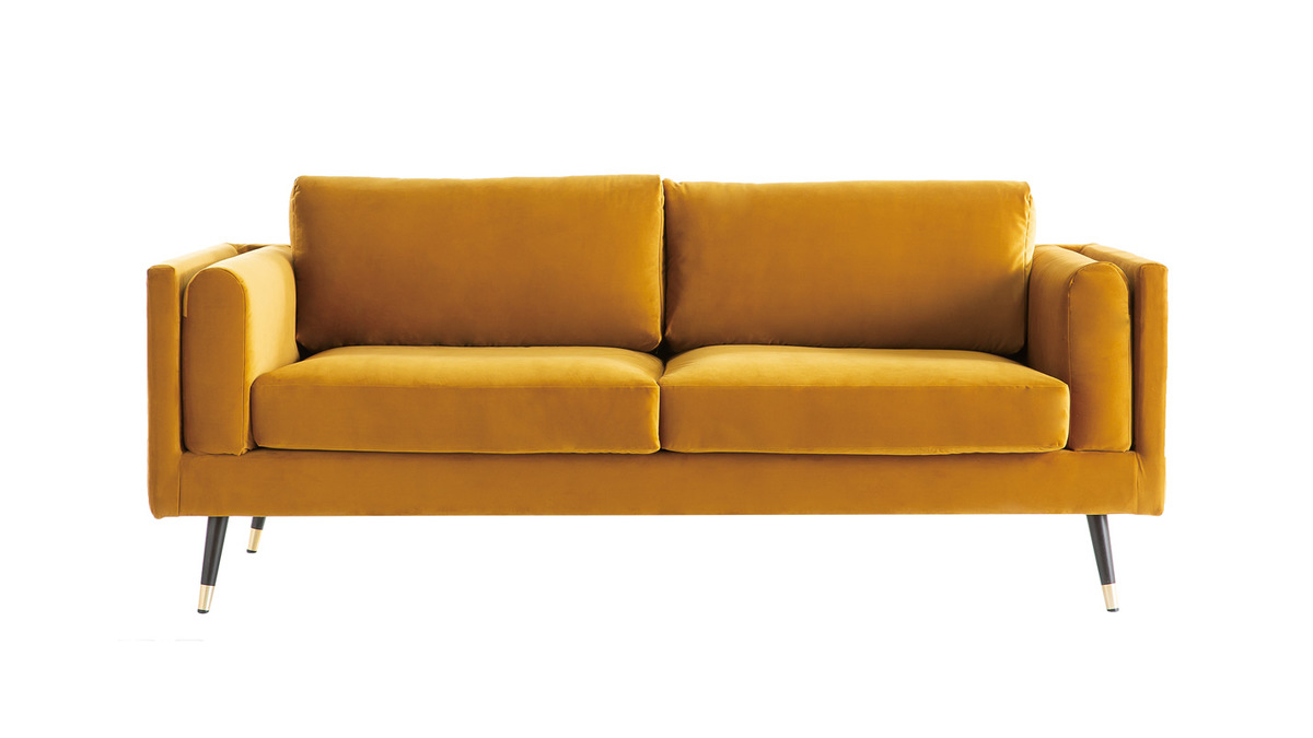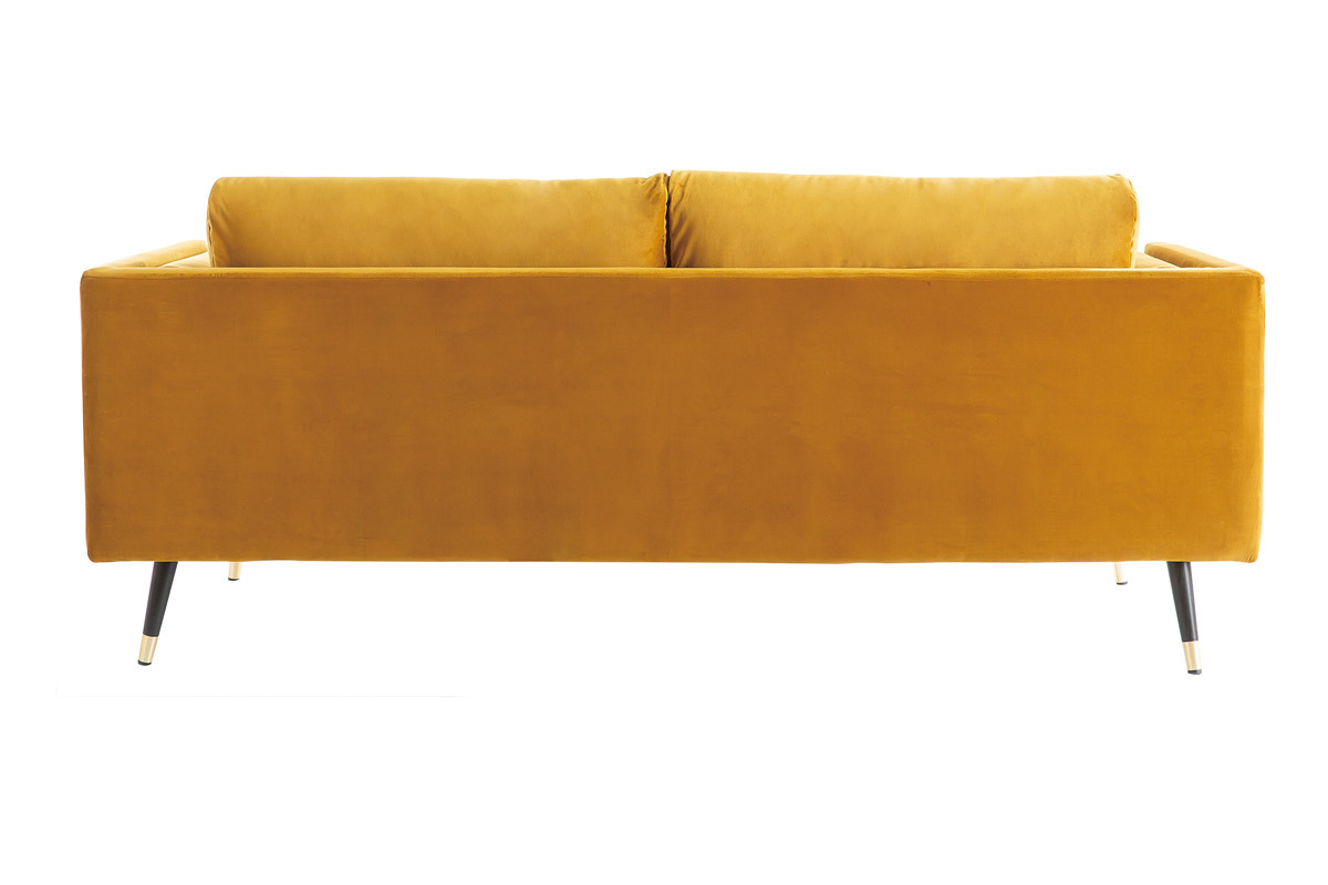 L'élégant revêtement en velours jaune moutarde (100% polyester) est joliment mis en valeur par les lignes essentielles du canapé. Le piètement fuselé en hêtre teinté noir et métal doré rappelle l'élégance des fifties. Il donne une allure aérienne au canapé.