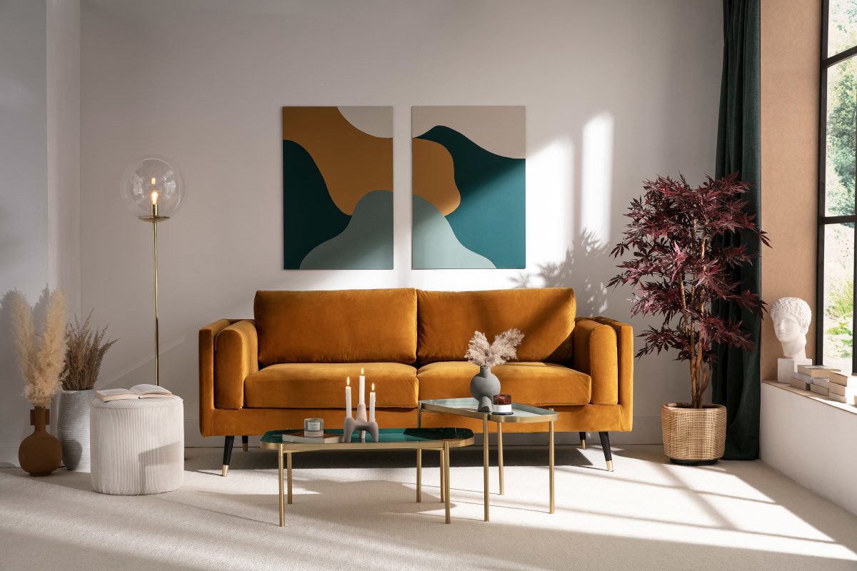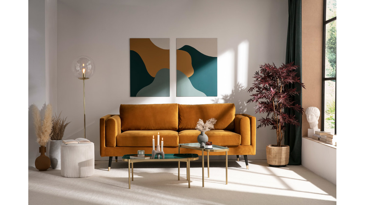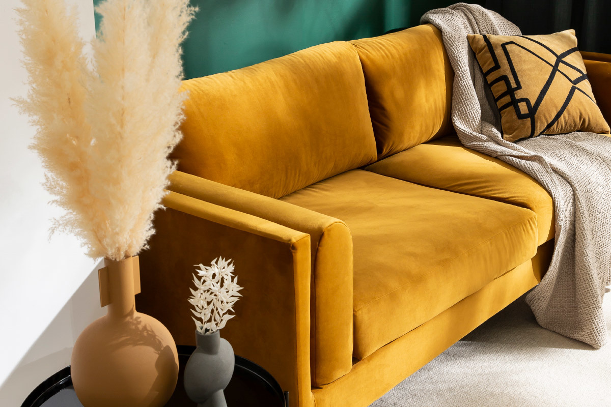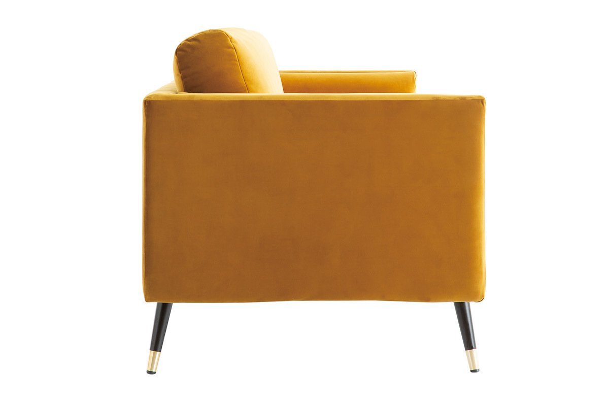L'élégant revêtement en velours jaune moutarde (100% polyester) est joliment mis en valeur par les lignes essentielles du canapé. Le piètement fuselé en hêtre teinté noir et métal doré rappelle l'élégance des fifties. Il donne une allure aérienne au canapé.