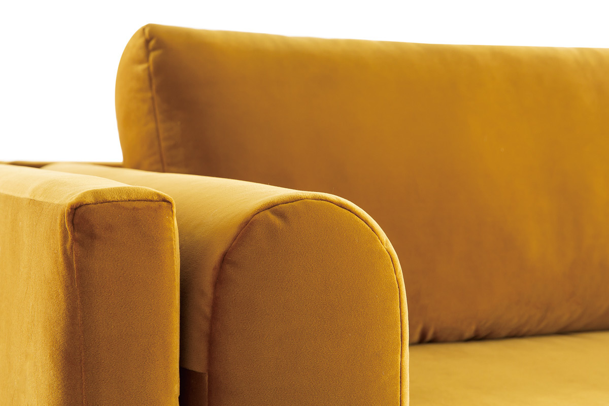 Avec ce canapé design en velours jaune moutarde, raffinement rime avec confort. L'assise généreusement rembourrée (mousse polyuréthane HR densité 30kg/m3 et ouate 150 g/m2) offre un confort durable. Signé par les deux coussins de dossier garnis de flocons de mousse, ce canapé 2-3 places à assise ferme garantit des moments de détente absolus !