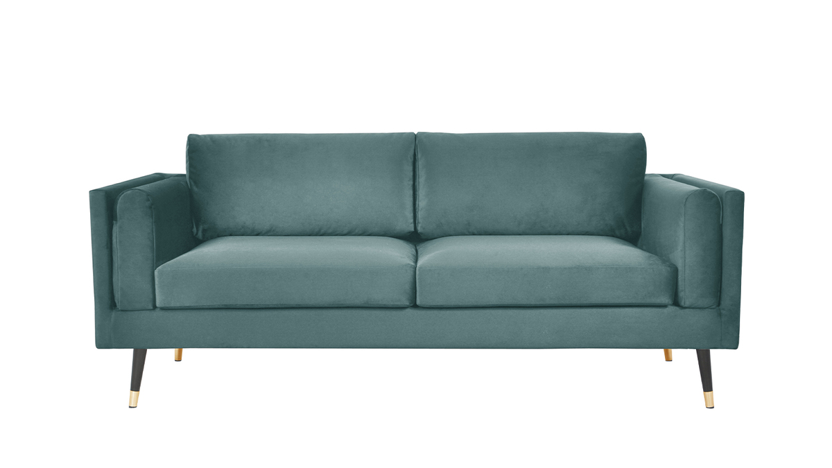 Avec sa silhouette délicate, son élégance intemporelle et ses petites dimensions (L207 x P87 x H91 cm), ce canapé céladon en tissu velours et pieds noirs et dorés s'intègre facilement dans tous les espaces.