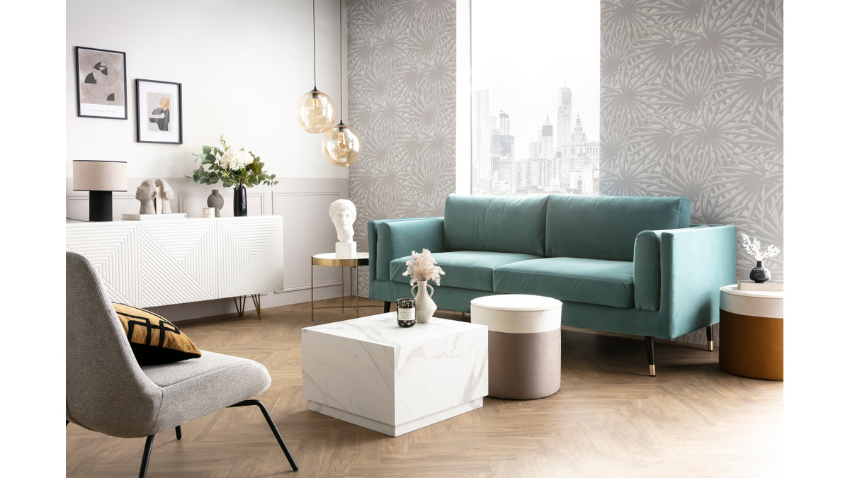Avec ce canapé design en velours céladon, raffinement rime avec confort. L'assise généreusement rembourrée (mousse polyuréthane HR densité 30kg/m3 et ouate 150 g/m2) offre un confort durable. Signé par les deux coussins de dossier garnis de flocons de mousse, ce canapé 2-3 places à assise ferme garantit des moments de détente absolus !