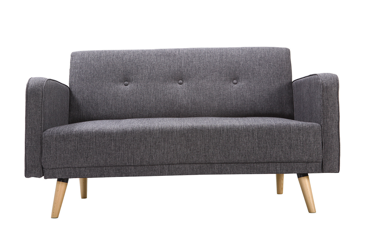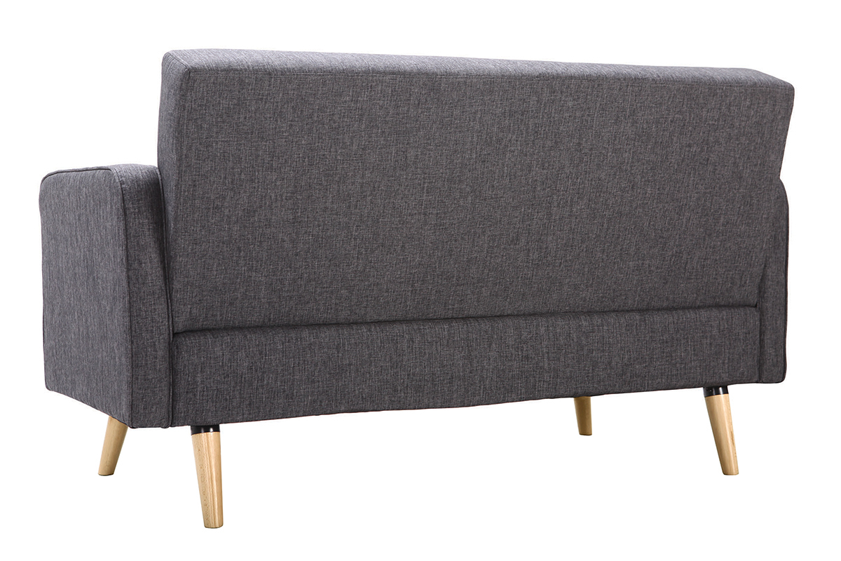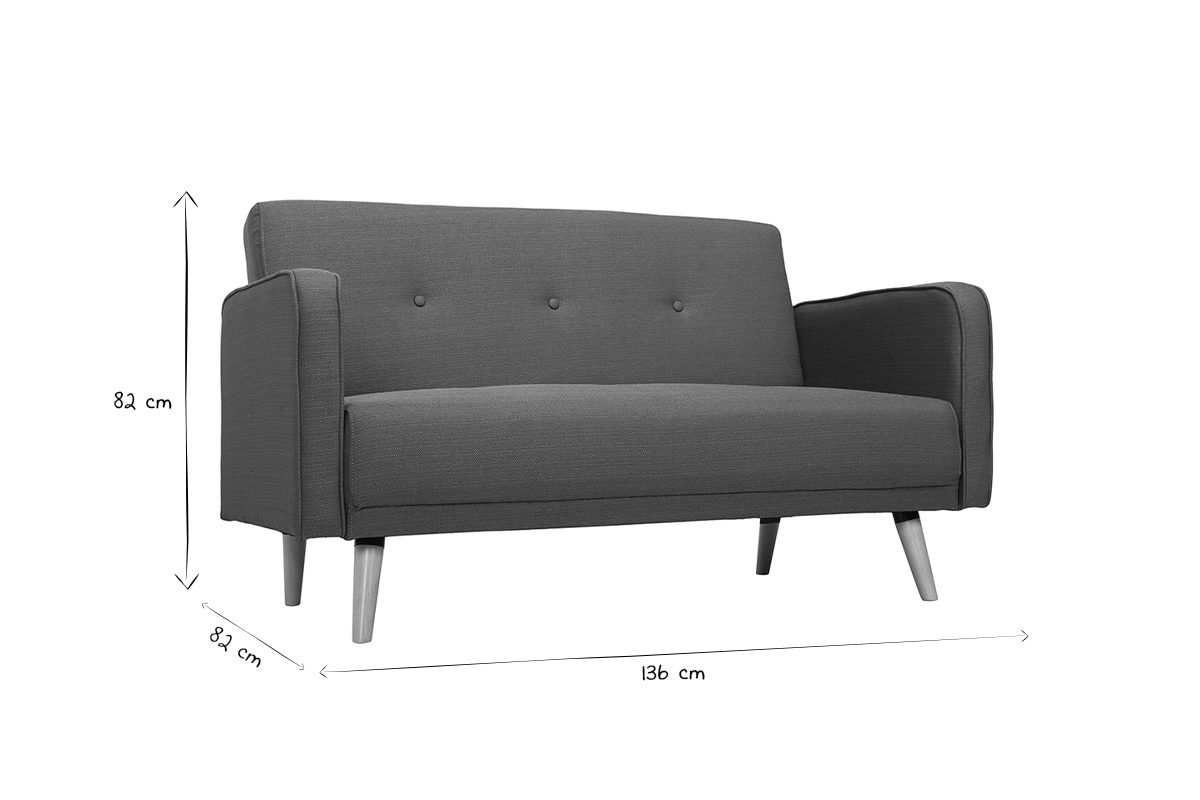 Avec son petit gabarit (dimensions L136 x P82 x H82 cm), ce véritable canapé 2 places en tissu gris anthracite et bois clair est idéal pour un studio ou un petit appartement.