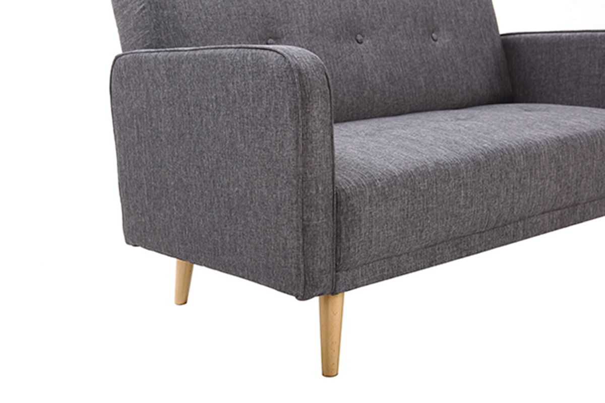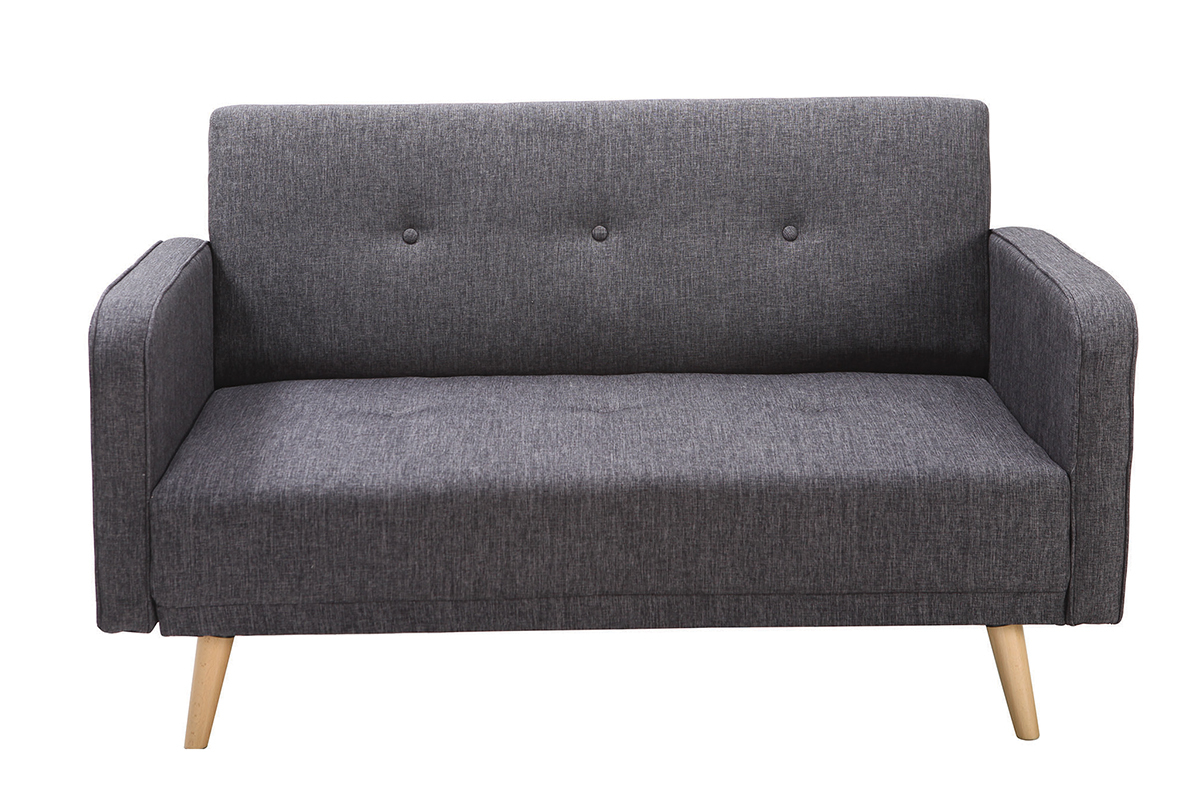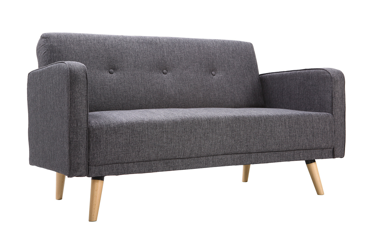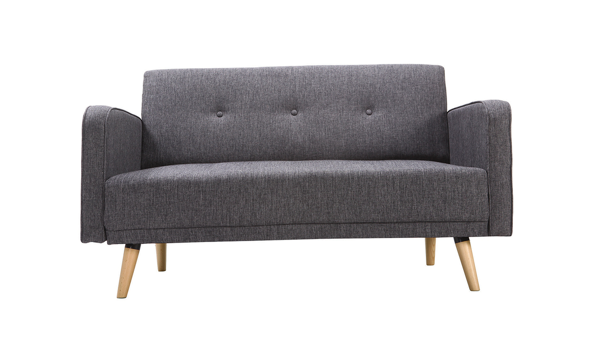 Avec son petit gabarit (dimensions L136 x P82 x H82 cm), ce véritable canapé 2 places en tissu gris anthracite et bois clair est idéal pour un studio ou un petit appartement.