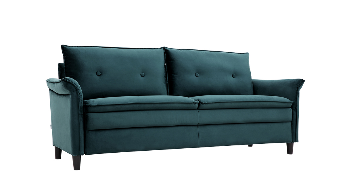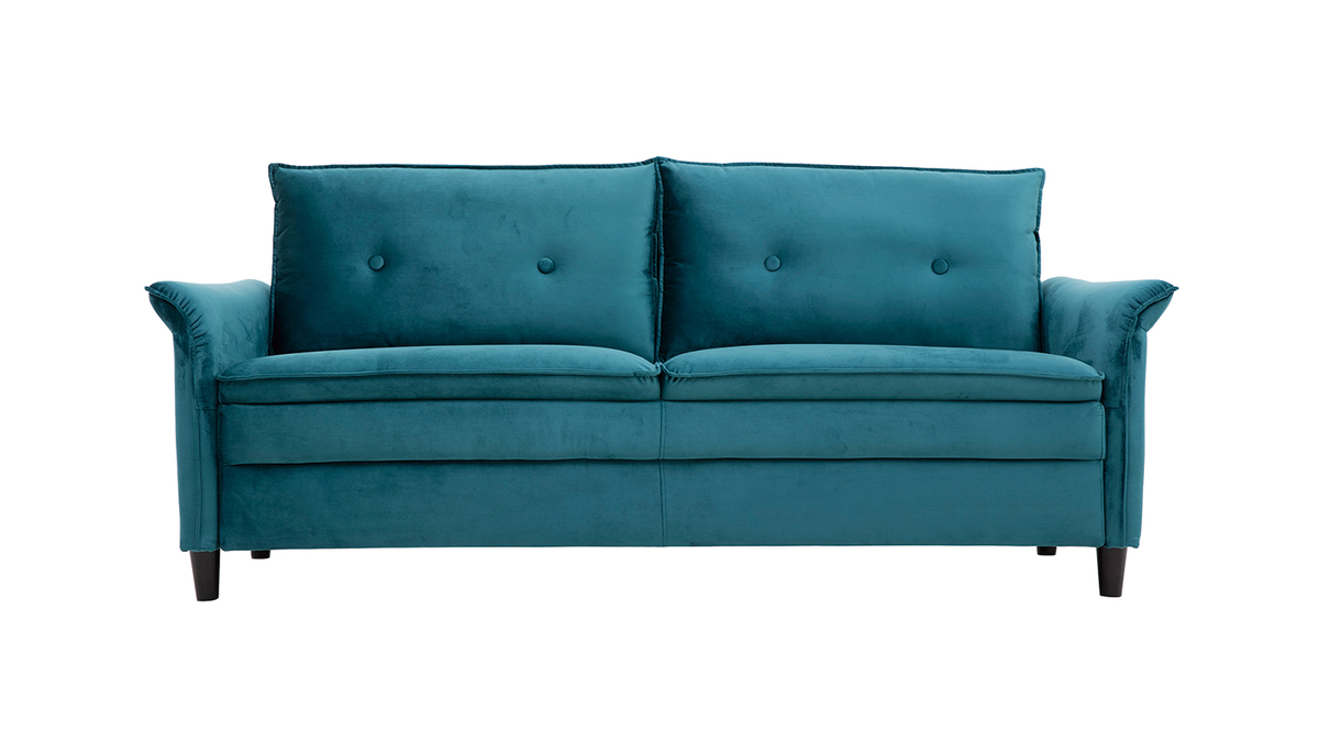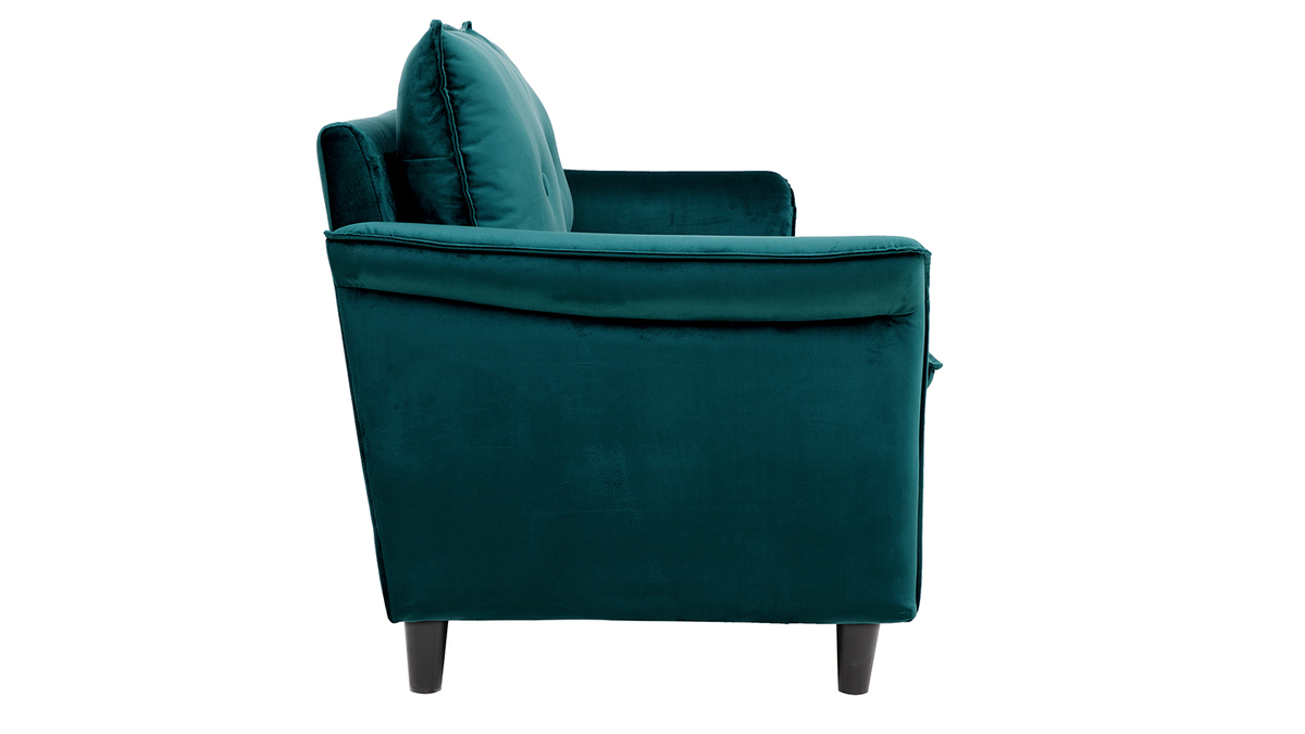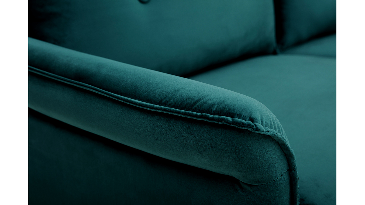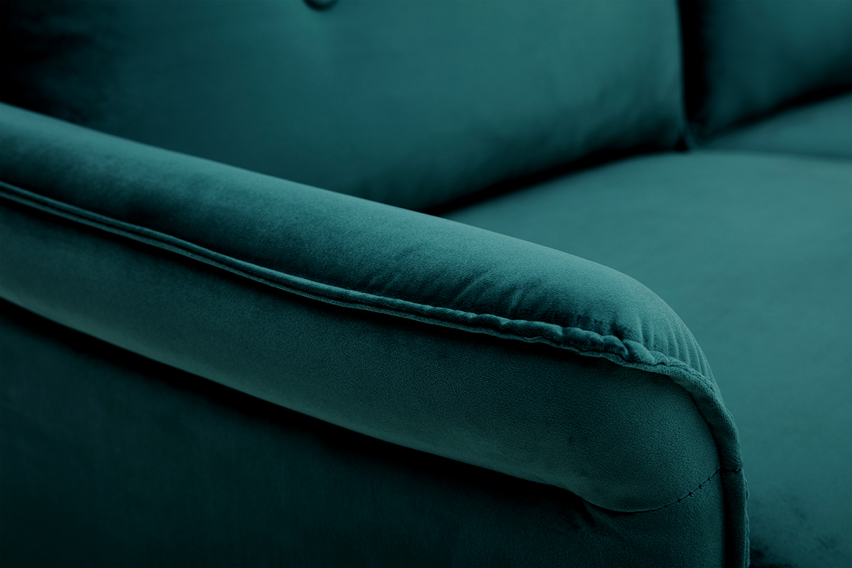 À mi-chemin entre un style moderne et classique, ce canapé en velours bleu pétrole a tout pour séduire : un revêtement doux et élégant au coeur des tendances, des formes originales avec des accoudoirs recourbés et un design qui marque les esprits.