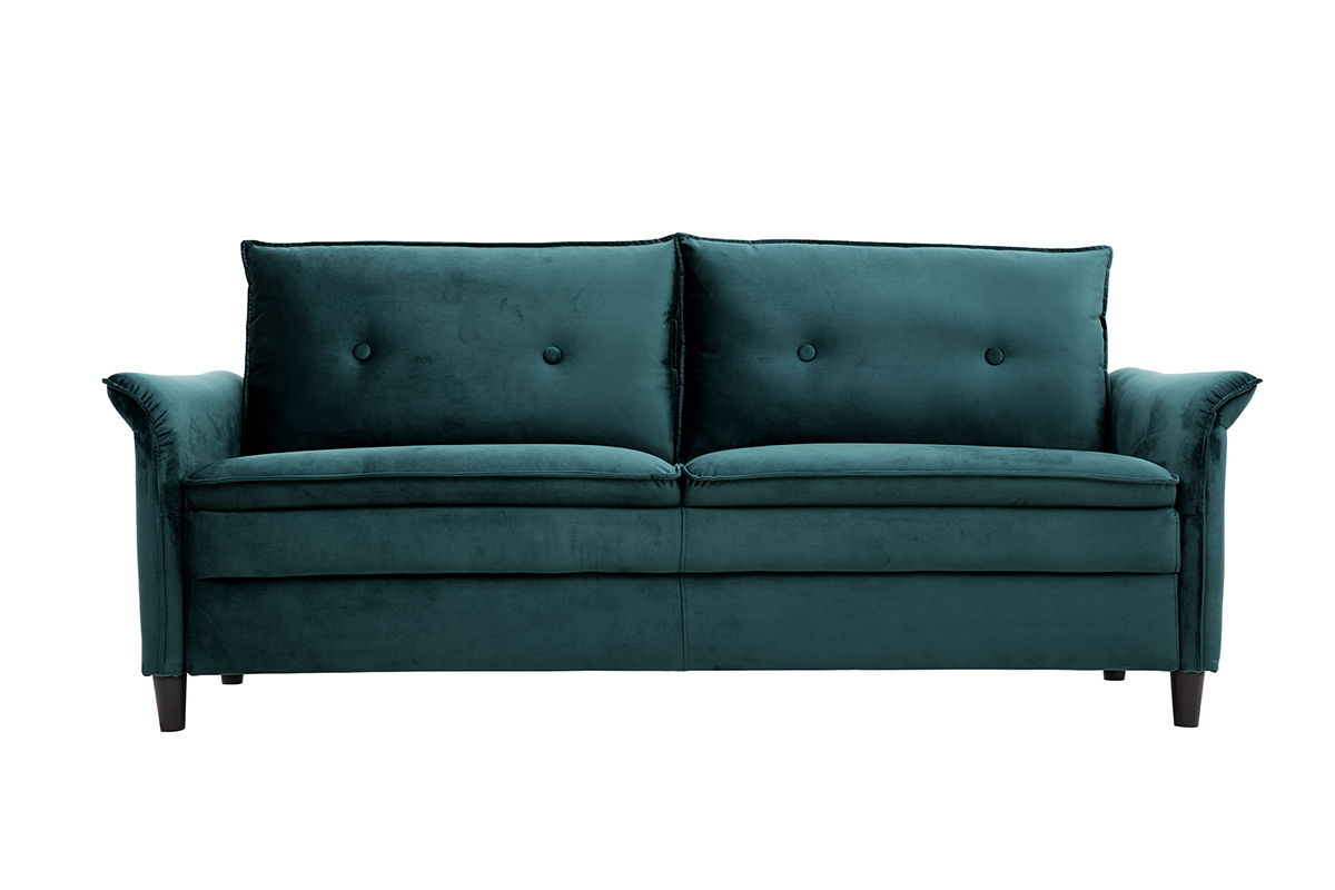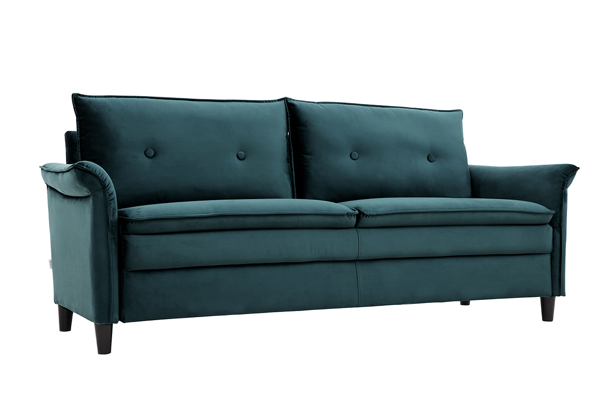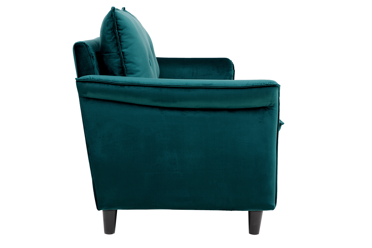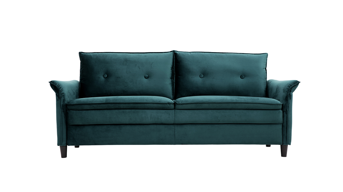À mi-chemin entre un style moderne et classique, ce canapé en velours bleu pétrole a tout pour séduire : un revêtement doux et élégant au coeur des tendances, des formes originales avec des accoudoirs recourbés et un design qui marque les esprits.