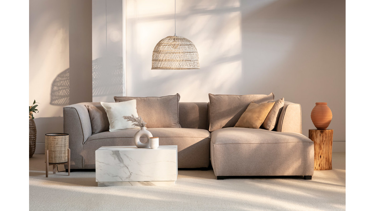 Ce canapé d'angle beige naturel se compose de deux éléments indépendants : un module d'angle gauche et une méridienne d'angle droit. Conçus pour s'assembler et former un grand canapé d'angle moderne 3-4 places. Ces sièges accueillants s'imaginent également séparés pour s'adapter à vos besoins. Assises fermes (densité 28 kg/m³) et dossiers moelleux (densité 17 kg/m³) s'habillent de coussins d'appoint, de quoi offrir à ce canapé d'angle beige naturel un confort d'assise des plus agréables.