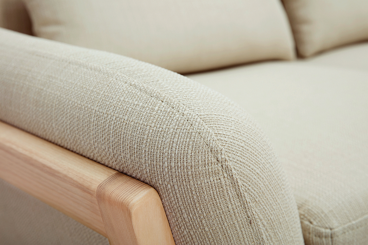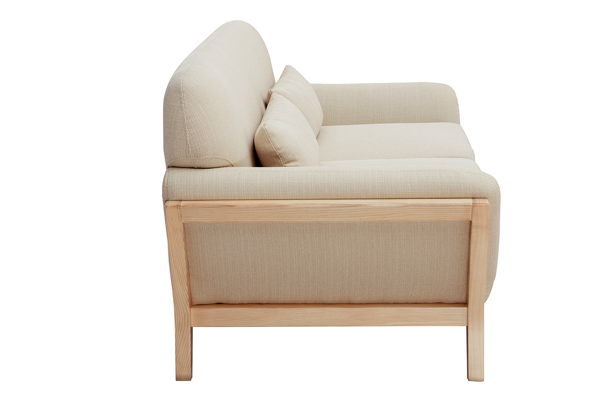 Le mariage entre une assise généreuse, habillée d'une trame 100% polyester - aussi agréable à l'oeil qu'au toucher - et une structure apparente en bois massif (frêne massif), fait tout le charme de ce canapé en tissu beige et bois clair.