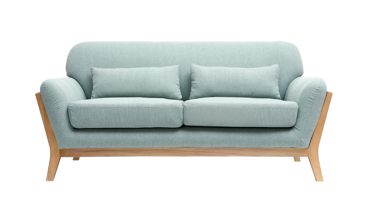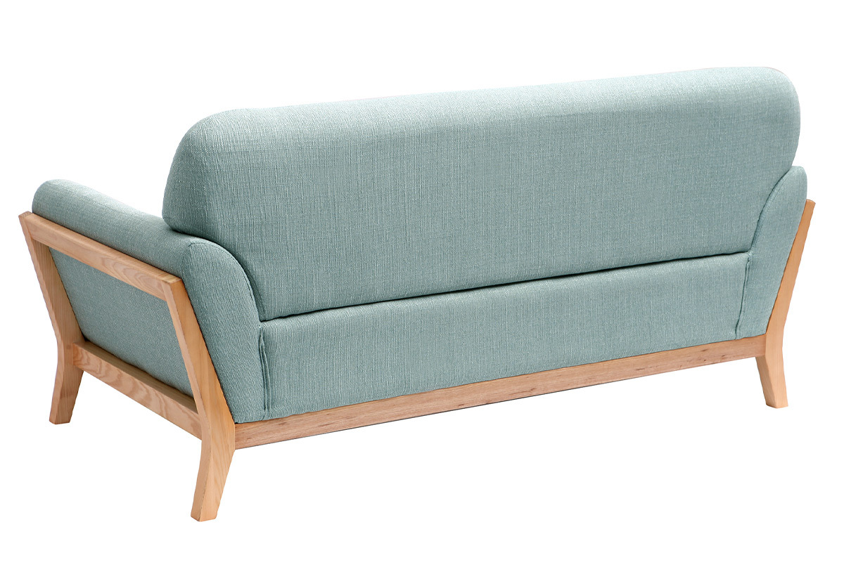 Le mariage entre une assise généreuse, habillée d'une trame 100% polyester - aussi agréable à l'oeil qu'au toucher - et une structure apparente en bois massif (frêne massif), fait tout le charme de ce canapé en tissu vert lagon et bois clair.