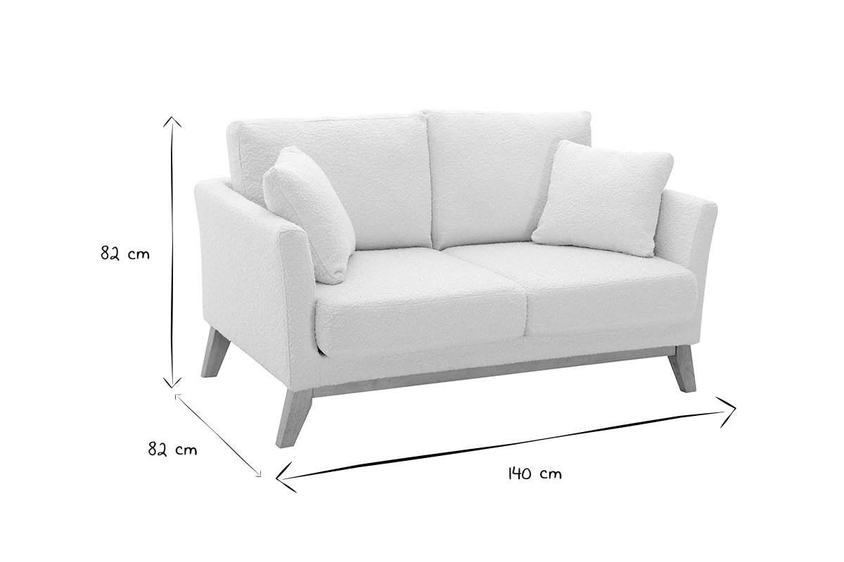 Avec ses dimensions L140 x P82 x H82 cm, ce petit canapé 2 places blanc est parfaitement adapté aux salons où chaque m² compte ! Grâce à ses deux gros coussins d'assise et de dossier ainsi que ses deux petits coussins d'appoint compris, il offre un bon confort d'assise. Les coussins étant déhoussables, recevez sans vous inquiéter de l'entretien de ce canapé en tissu bouclette écru.