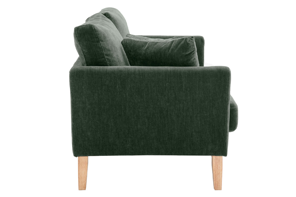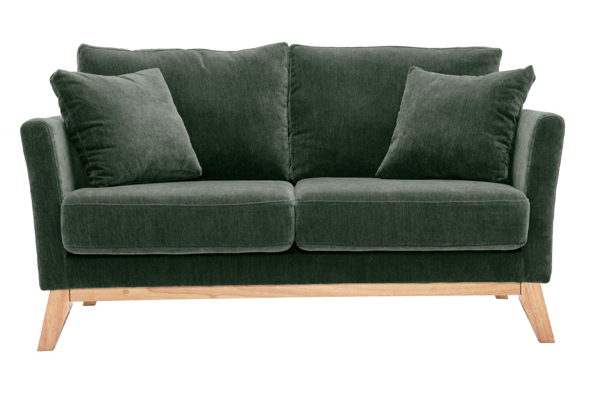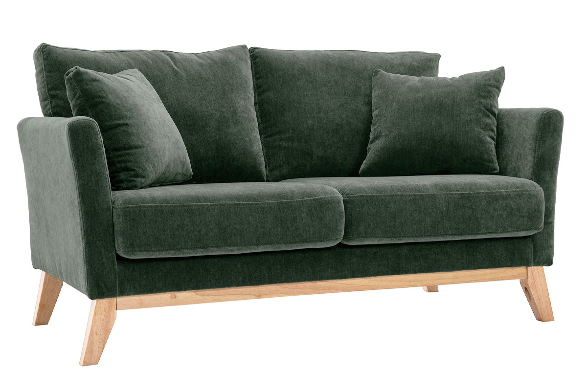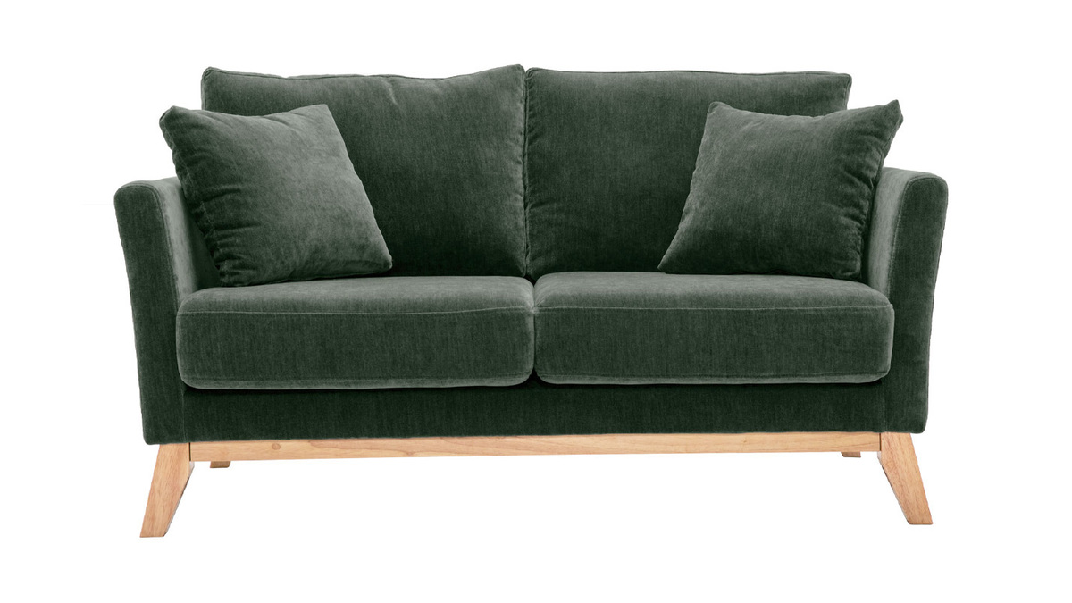 Canapé scandinave déhoussable 2 places en tissu effet velours kaki et bois clair OSLO livré prêt à assembler. Montage simple, seuls les pieds sont à fixer.