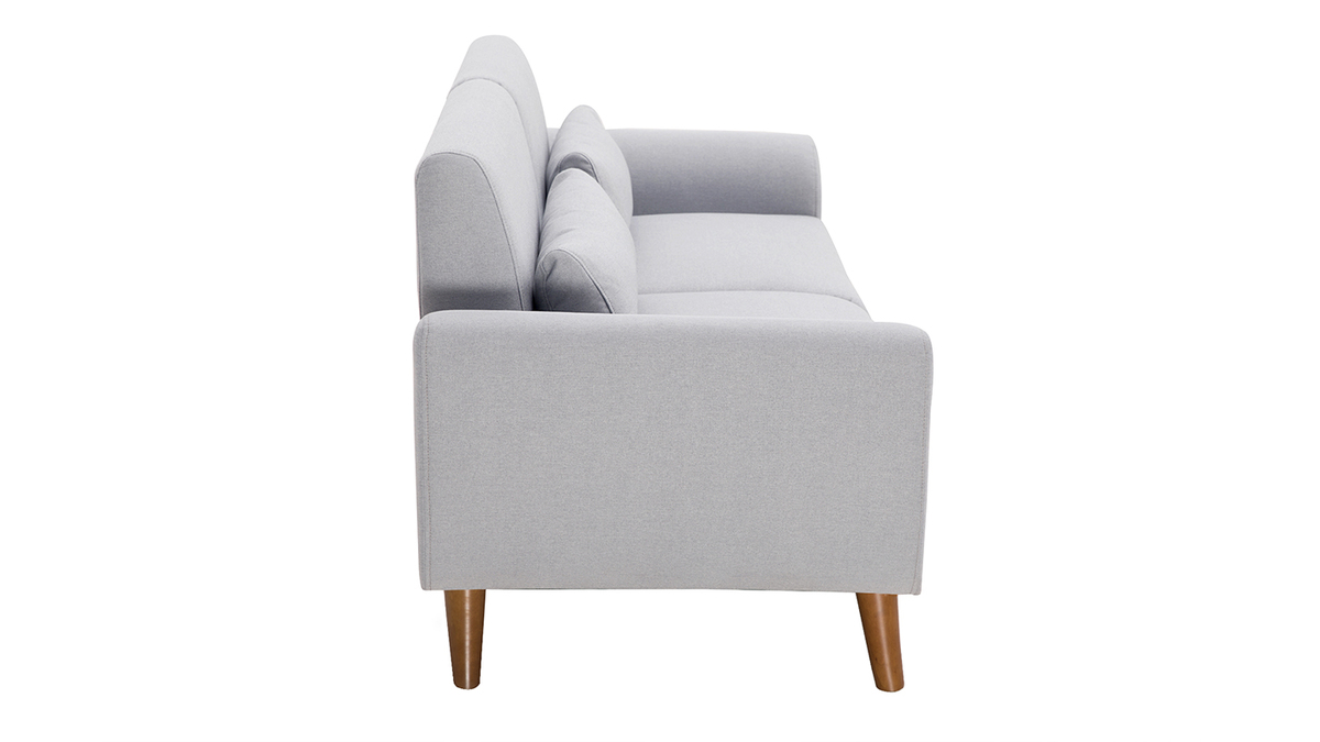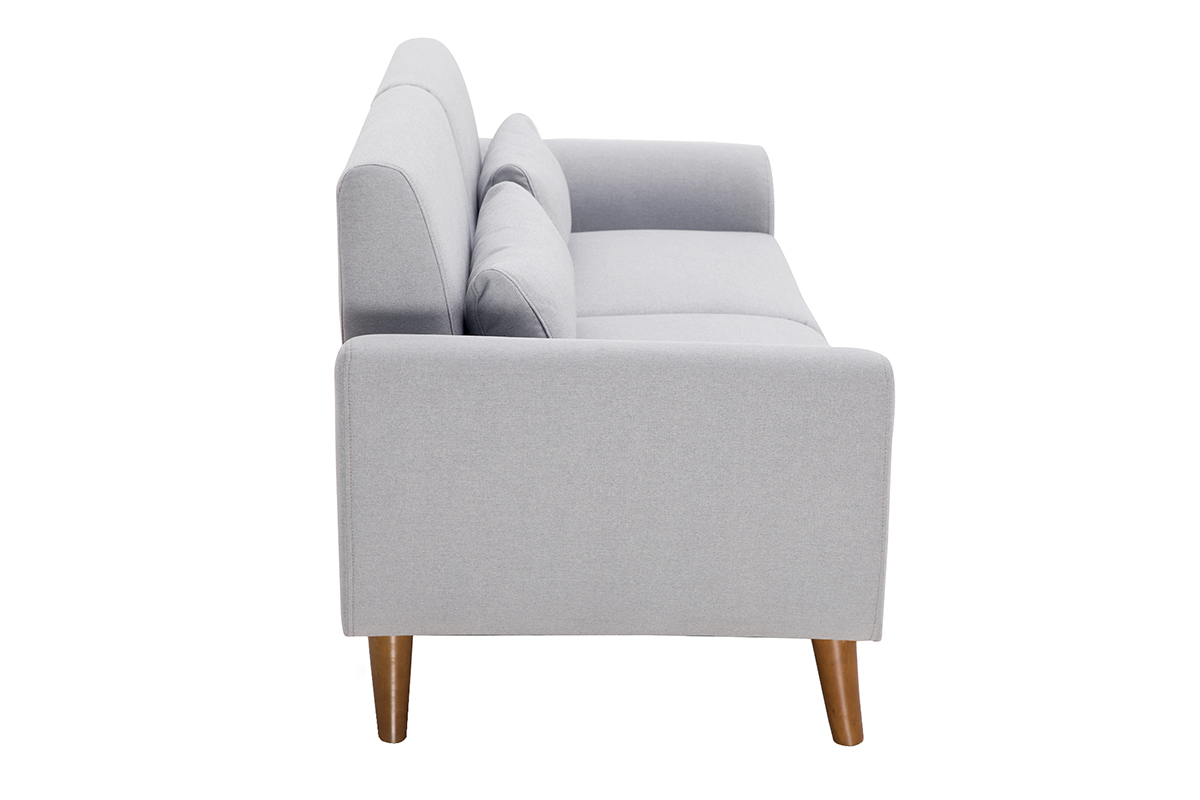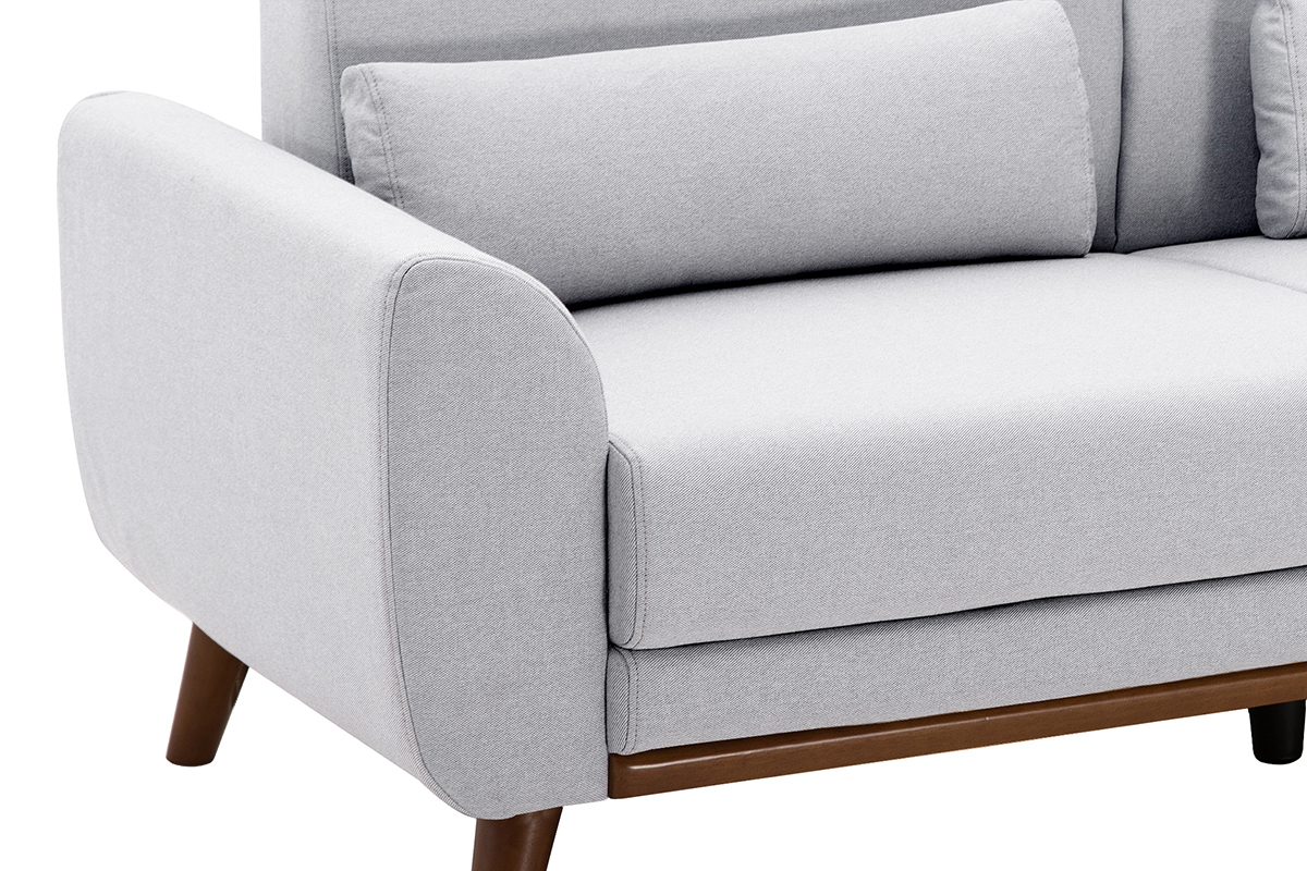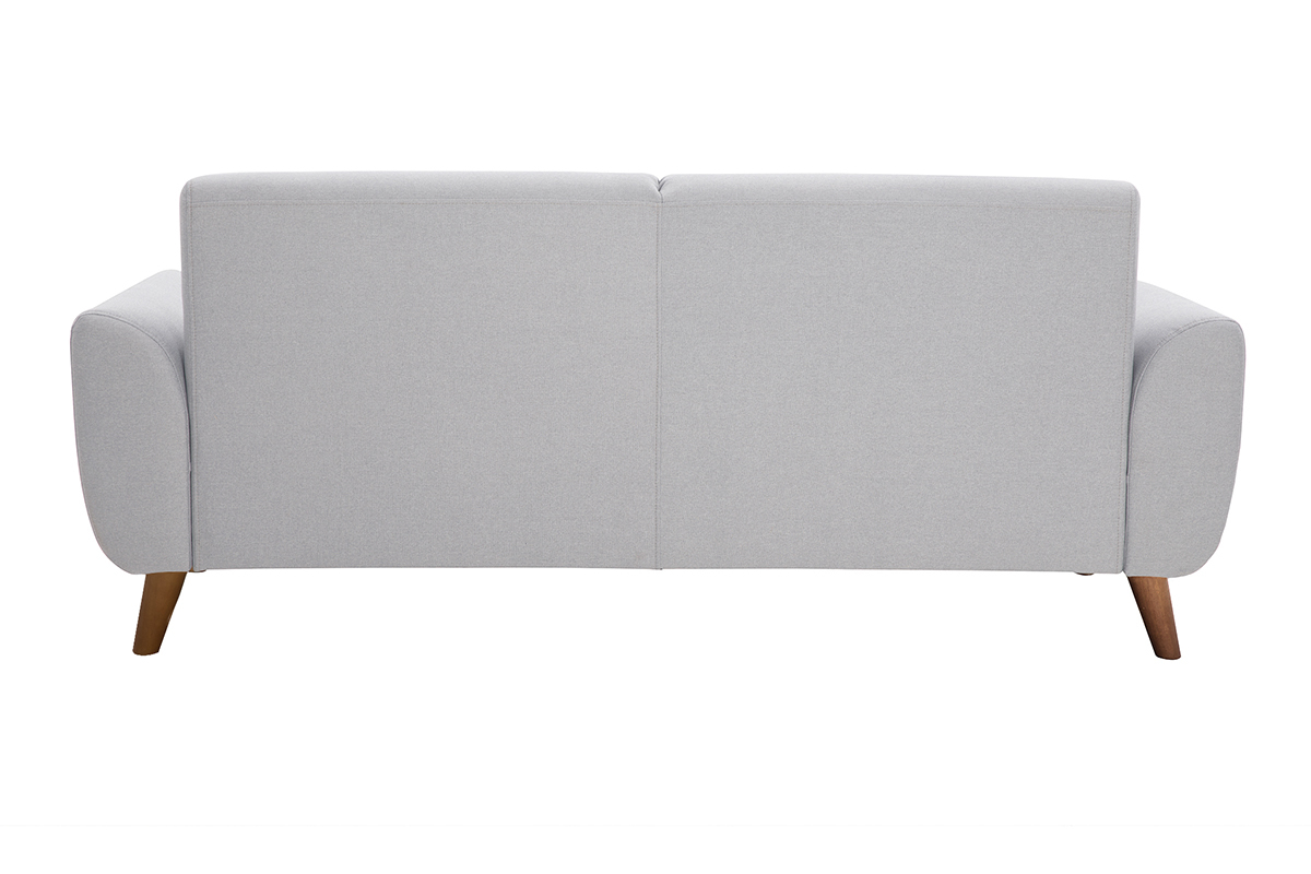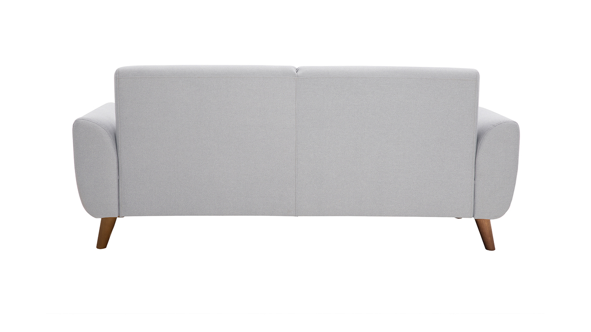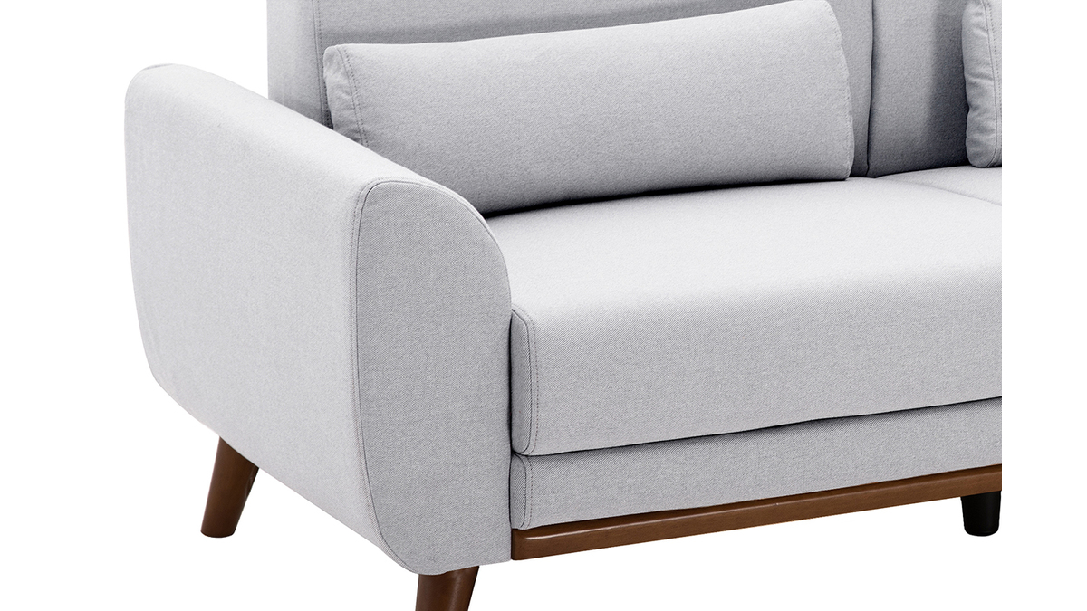 Canapé tendance au style inimitable, on souligne l'élégante alliance du revêtement tissu gris, des lignes arrondies et d'un piètement en hévéa massif teinté noyer.