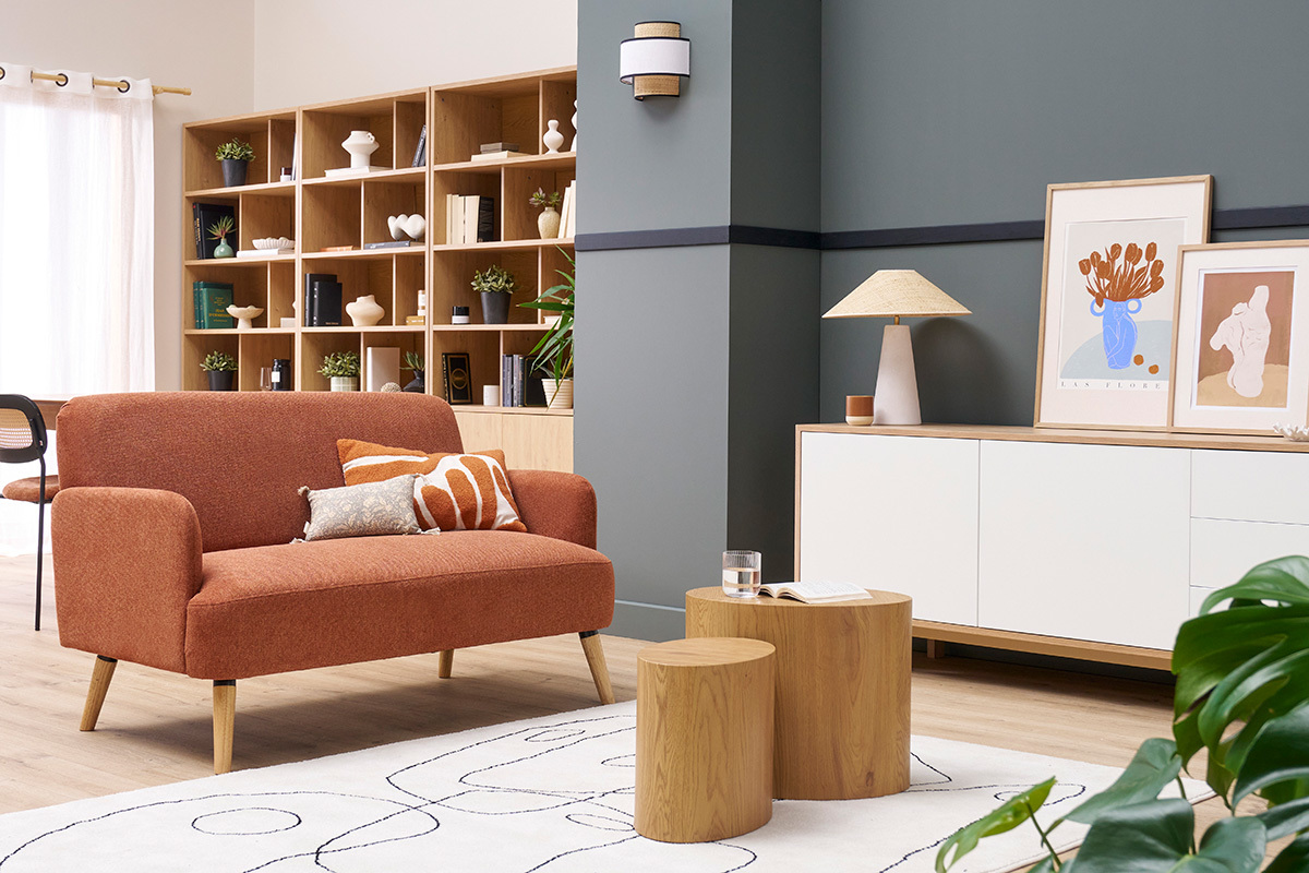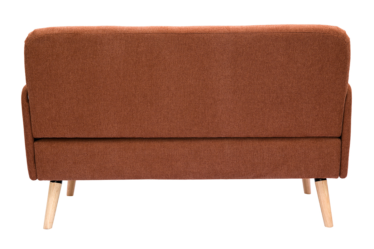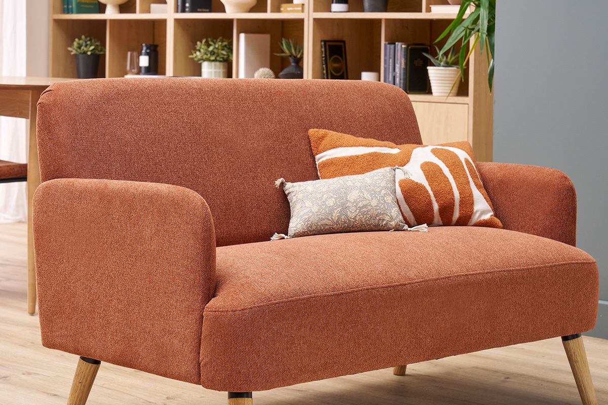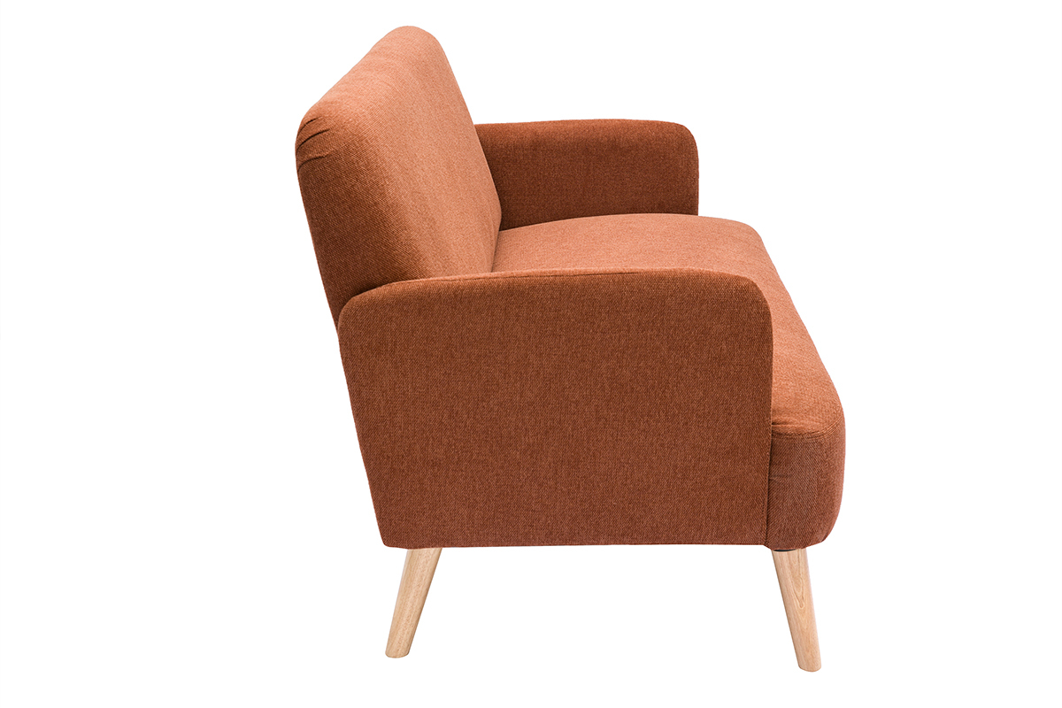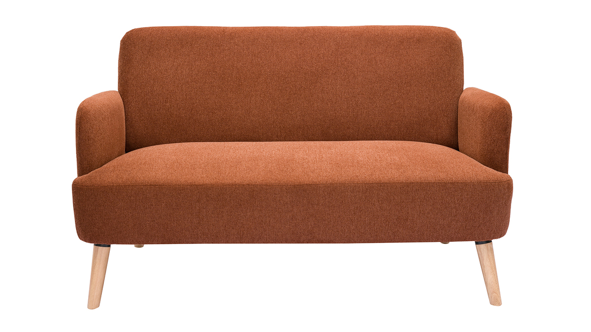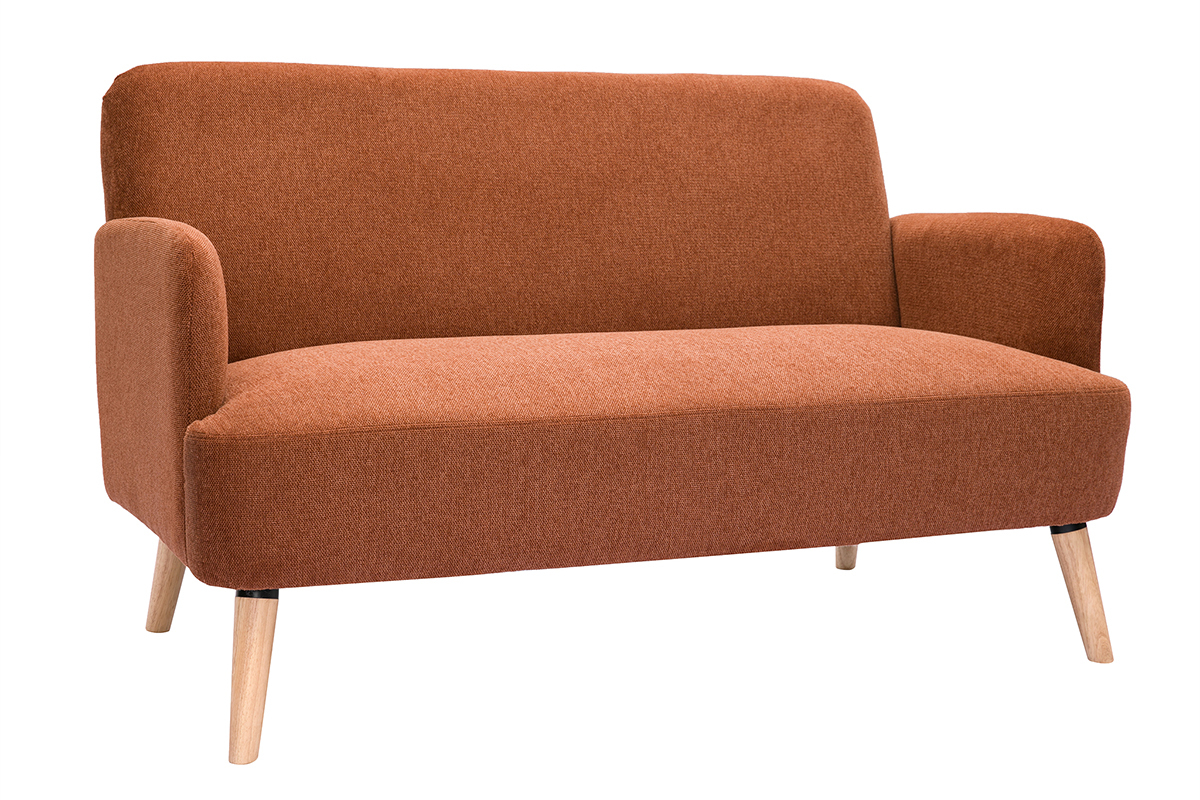 Canapé en tissu effet velours texturé terre brûlée et bois clair livré prêt à monter.