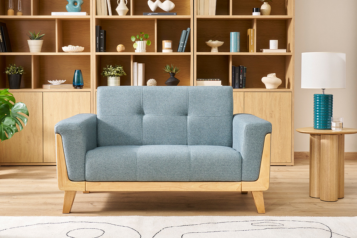 Ce canapé 2 places attire d'emblée l'attention par sa structure en bois qui souligne parfaitement sa silhouette nordique. Le bas de l'assise et le bord des accoudoirs en bois d'eucalyptus créent une belle continuité avec les pieds en hévéa massif ! Ensemble, ils mettent joliment en valeur les lignes galbées de ce canapé convivial.