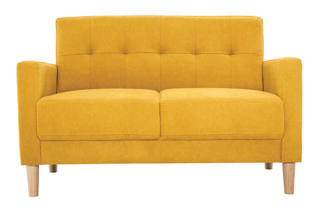 Avec son assise pour deux personnes en tissu effet velours jaune moutarde, il apporte une touche chaleureuse et une teinte tendance à votre intérieur. Ce canapé joue sur un subtil jeu de formes et un dossier capitonné qui convient parfaitement à un salon classique ou plus moderne.