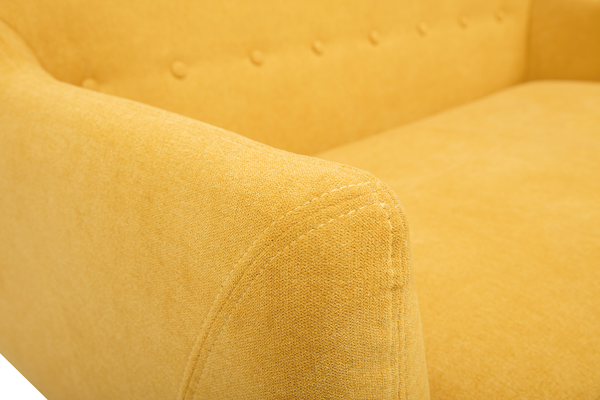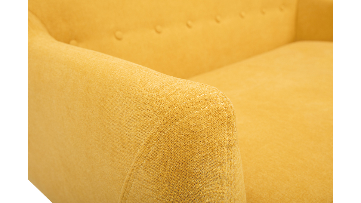 Canapé jaune moutarde livré prêt à assembler, seuls les pieds sont à fixer.