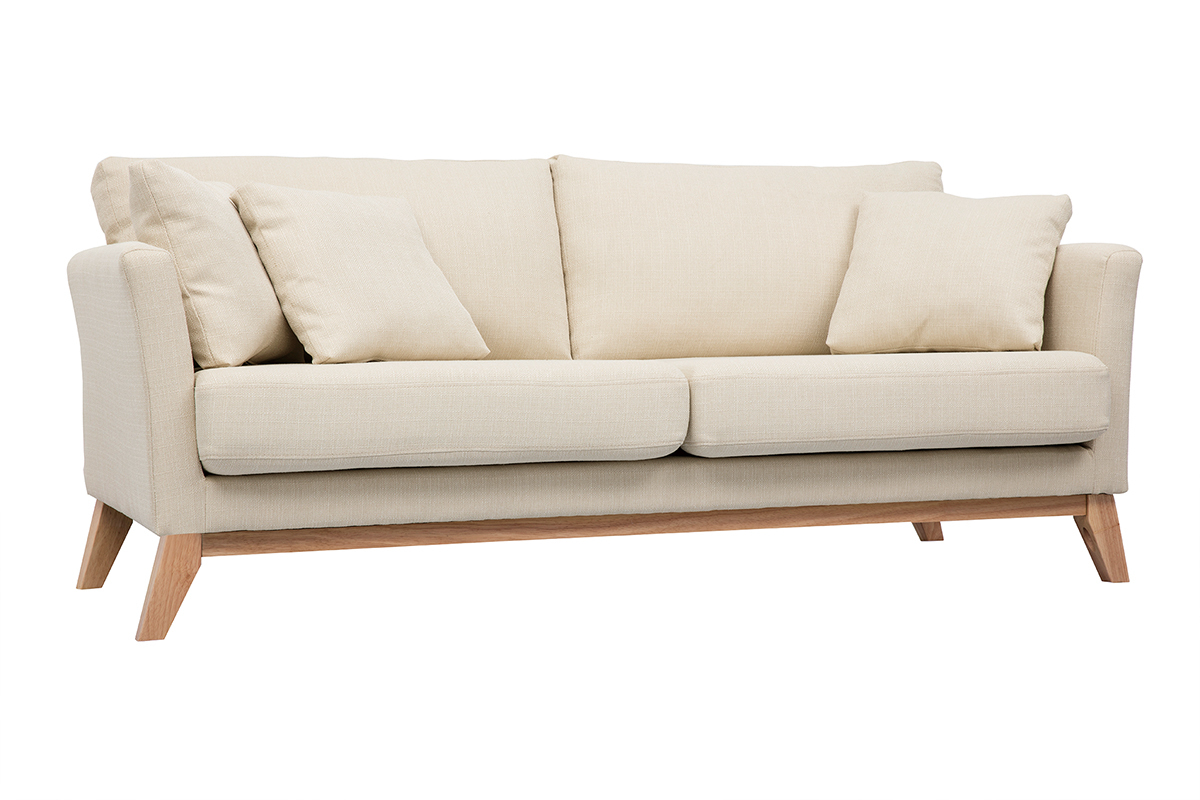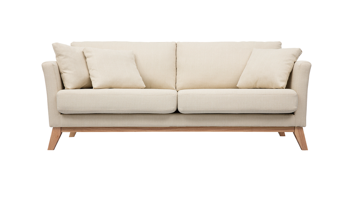 Canapé scandinave déhoussable 3 places en tissu beige et bois clair OSLO livré prêt à assembler. Montage simple, seuls les pieds sont à fixer.